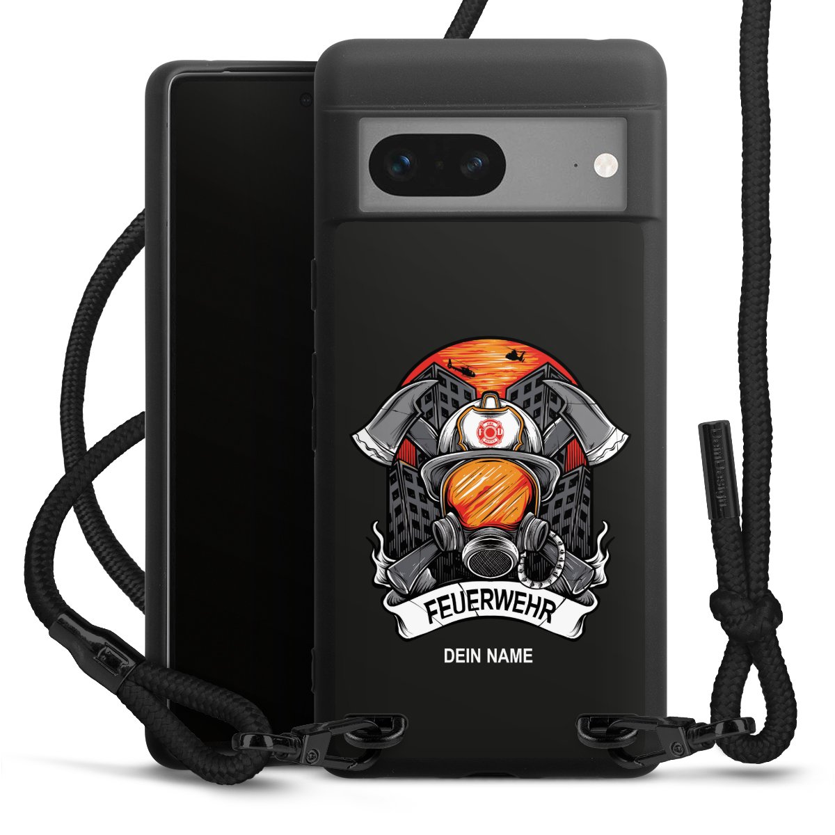 The matt black silicone case is made of flexible TPU (thermoplastic polyurethane) and offers robust protection. The durable, unbreakable material makes the cover flexible and dimensionally stable at the same time. The matte surface makes your design stand out more and is less susceptible to fingerprints and dirt. The stylish trend accessory fits comfortably in the hand and is perfectly complemented by the fabric (polyester) mobile phone strap. The braided fabric strap is approx. 1.70 metres long with a diameter of approx. 0.5 cm. Due to the special knotting technique, the length of the strap can be adjusted by simply pulling it, so that you can adapt it individually to your wishes. The practical case to wear around your neck is available with the fabric strap in black. As a little icing on the cake, we have provided the strap with a chic metal fastener in matt black. The strap is securely fastened to the case with loops made of high-quality genuine leather and press studs. The ends of the fabric strap are covered with metallic end caps and thus protected from fraying.