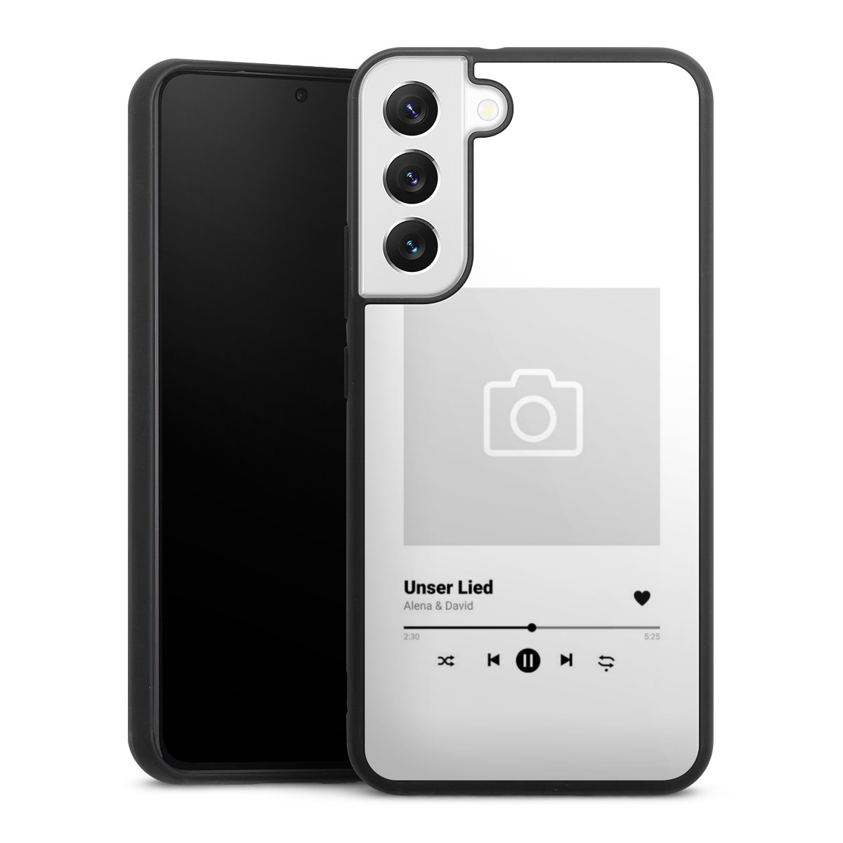 We print your design on the back of the glass inlay and then connect it firmly to the silicone case ,so that nothing sticks out and everything looks like it was cast from one piece. In addition, the sturdy glass element is protected from scratches by an additional coating and ensures a slight reflection on the shiny print image.