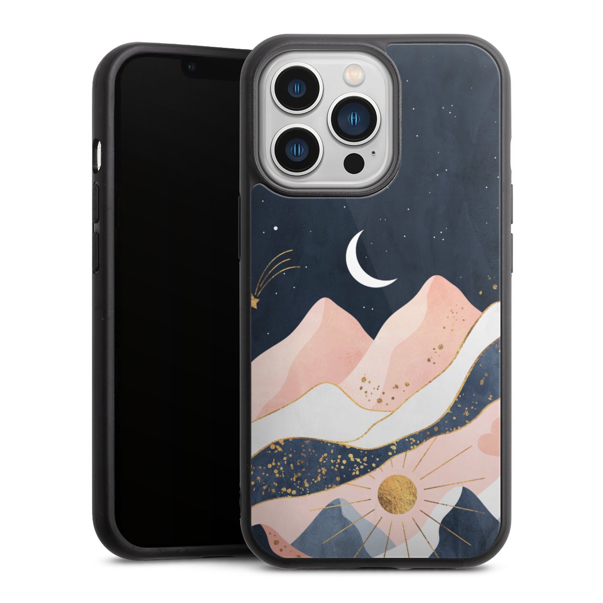 We print your design on the back of the glass inlay and then connect it firmly to the silicone case ,so that nothing sticks out and everything looks like it was cast from one piece. In addition, the sturdy glass element is protected from scratches by an additional coating and ensures a slight reflection on the shiny print image.