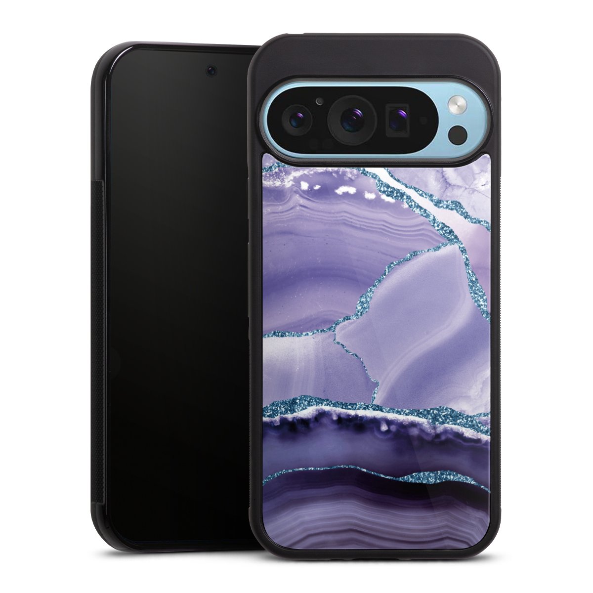 We print your design on the back of the glass inlay and then connect it firmly to the silicone case ,so that nothing sticks out and everything looks like it was cast from one piece. In addition, the sturdy glass element is protected from scratches by an additional coating and ensures a slight reflection on the shiny print image.