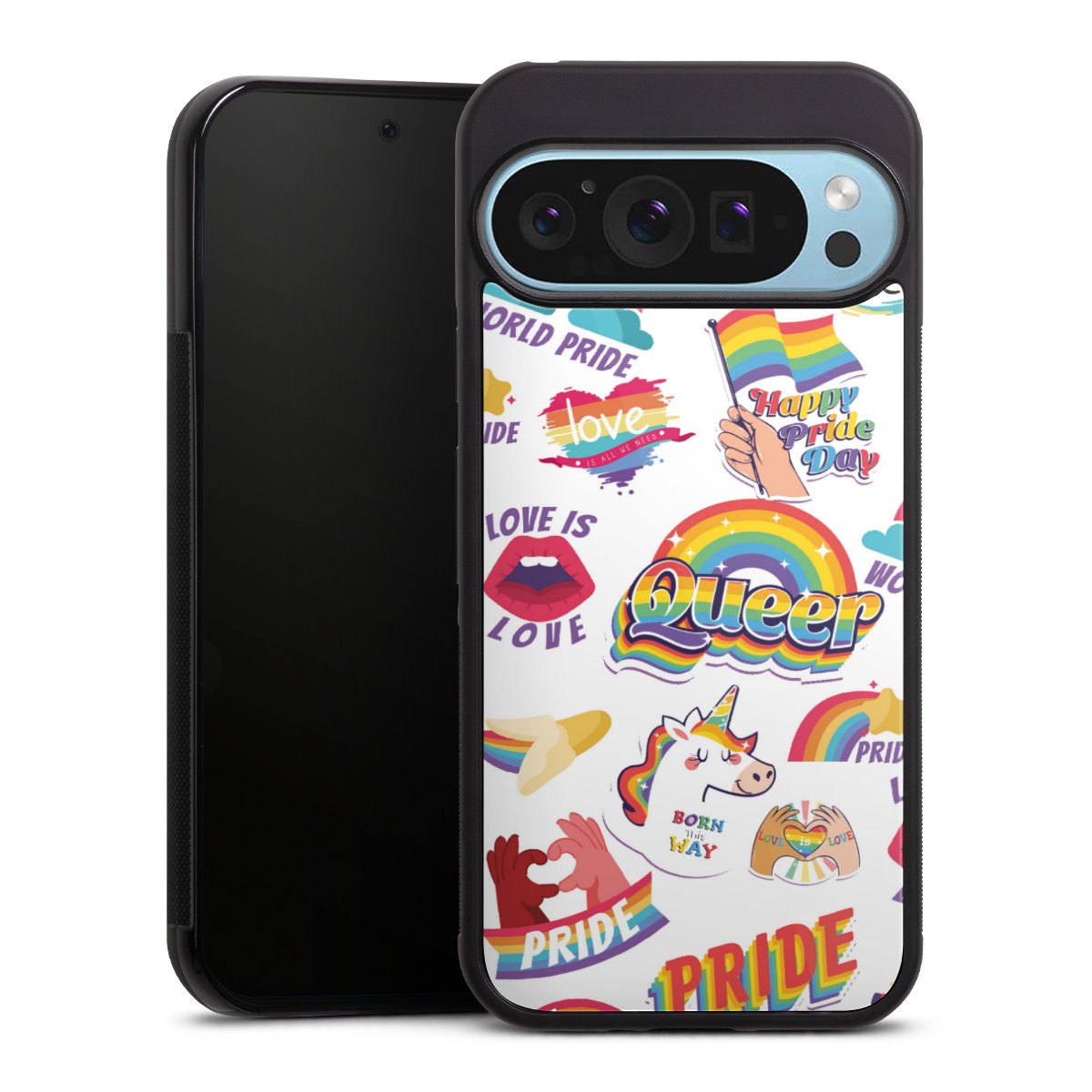 We print your design on the back of the glass inlay and then connect it firmly to the silicone case ,so that nothing sticks out and everything looks like it was cast from one piece. In addition, the sturdy glass element is protected from scratches by an additional coating and ensures a slight reflection on the shiny print image.