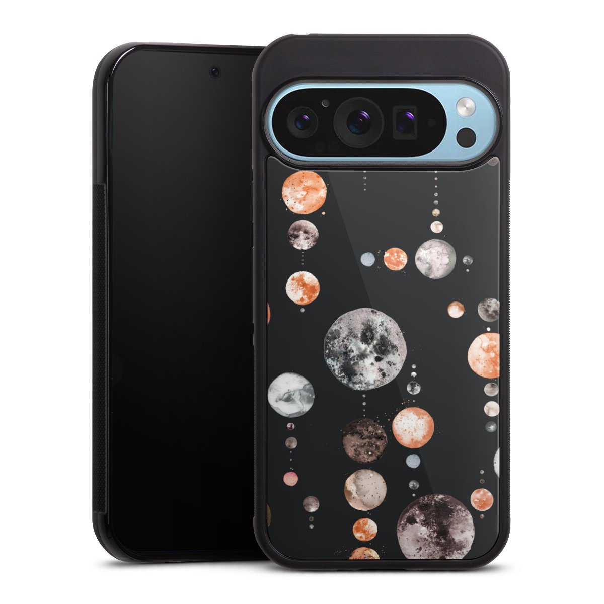 We print your design on the back of the glass inlay and then connect it firmly to the silicone case ,so that nothing sticks out and everything looks like it was cast from one piece. In addition, the sturdy glass element is protected from scratches by an additional coating and ensures a slight reflection on the shiny print image.