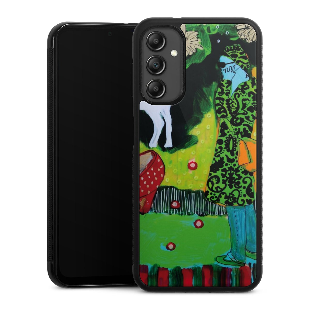 We print your design on the back of the glass inlay and then connect it firmly to the silicone case ,so that nothing sticks out and everything looks like it was cast from one piece. In addition, the sturdy glass element is protected from scratches by an additional coating and ensures a slight reflection on the shiny print image.