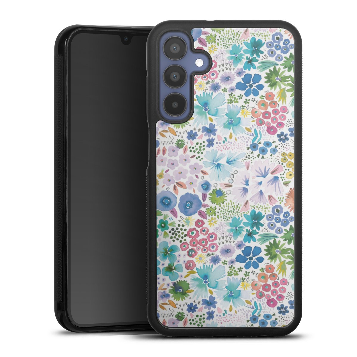 We print your design on the back of the glass inlay and then connect it firmly to the silicone case ,so that nothing sticks out and everything looks like it was cast from one piece. In addition, the sturdy glass element is protected from scratches by an additional coating and ensures a slight reflection on the shiny print image.