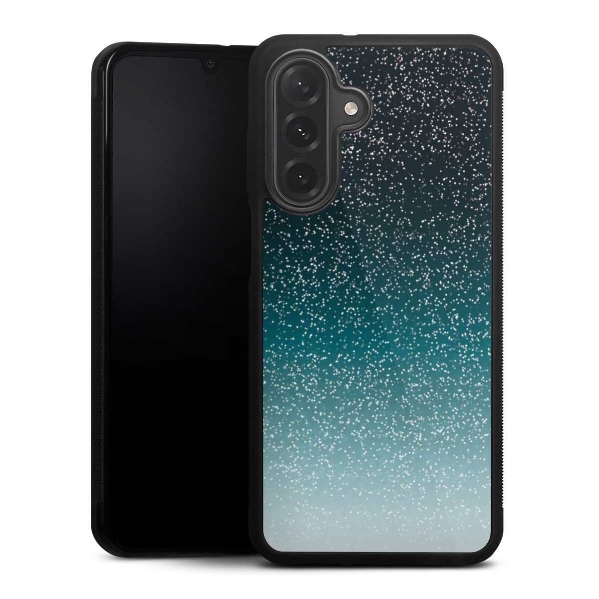 We print your design on the back of the glass inlay and then connect it firmly to the silicone case ,so that nothing sticks out and everything looks like it was cast from one piece. In addition, the sturdy glass element is protected from scratches by an additional coating and ensures a slight reflection on the shiny print image.
