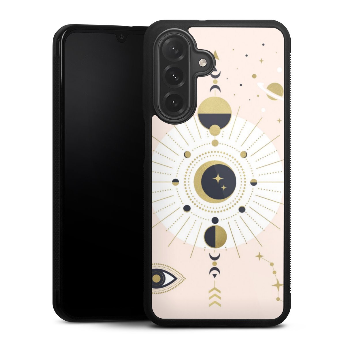 We print your design on the back of the glass inlay and then connect it firmly to the silicone case ,so that nothing sticks out and everything looks like it was cast from one piece. In addition, the sturdy glass element is protected from scratches by an additional coating and ensures a slight reflection on the shiny print image.