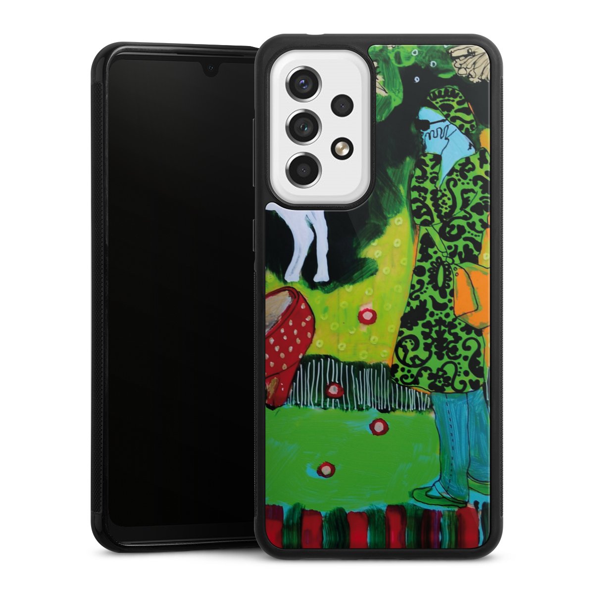 We print your design on the back of the glass inlay and then connect it firmly to the silicone case ,so that nothing sticks out and everything looks like it was cast from one piece. In addition, the sturdy glass element is protected from scratches by an additional coating and ensures a slight reflection on the shiny print image.