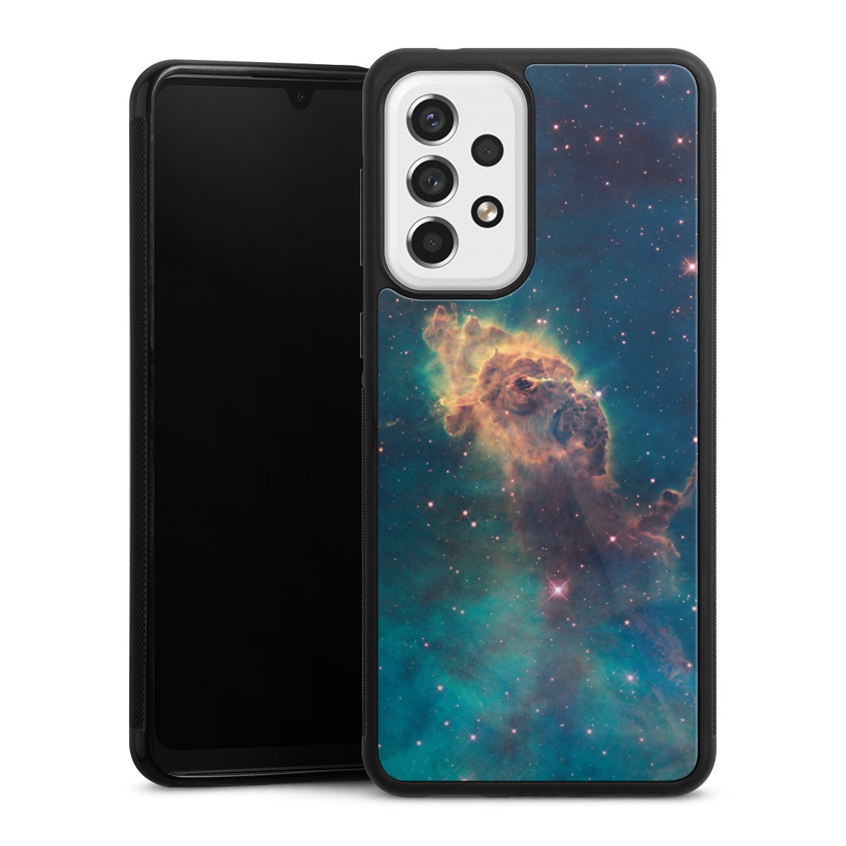 We print your design on the back of the glass inlay and then connect it firmly to the silicone case ,so that nothing sticks out and everything looks like it was cast from one piece. In addition, the sturdy glass element is protected from scratches by an additional coating and ensures a slight reflection on the shiny print image.