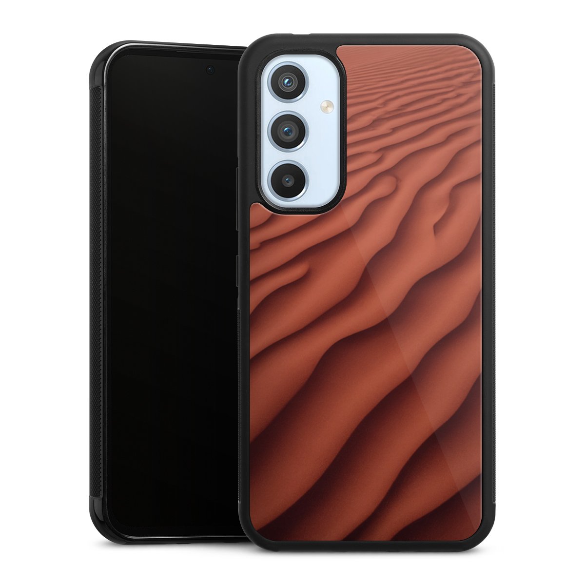 We print your design on the back of the glass inlay and then connect it firmly to the silicone case ,so that nothing sticks out and everything looks like it was cast from one piece. In addition, the sturdy glass element is protected from scratches by an additional coating and ensures a slight reflection on the shiny print image.