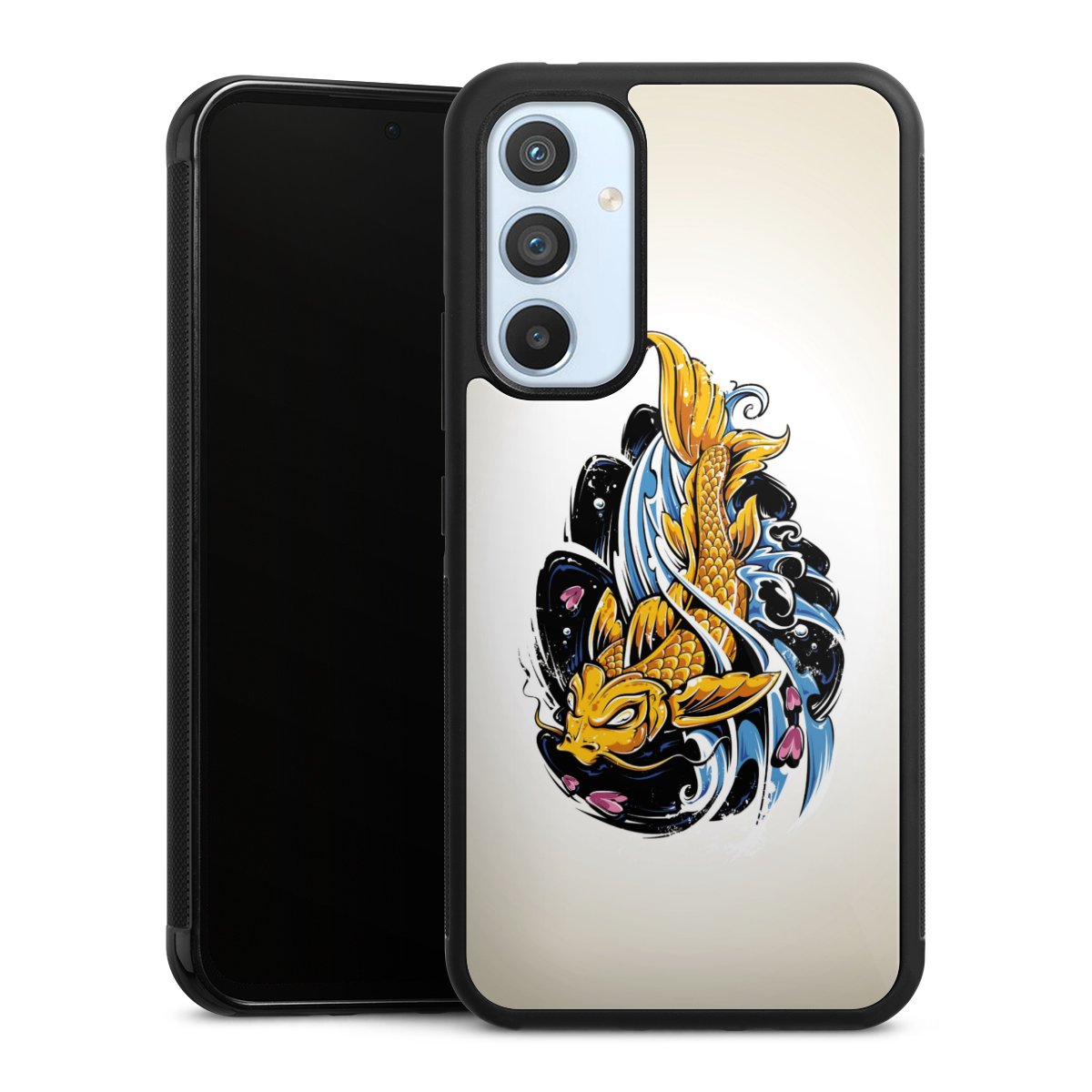 We print your design on the back of the glass inlay and then connect it firmly to the silicone case ,so that nothing sticks out and everything looks like it was cast from one piece. In addition, the sturdy glass element is protected from scratches by an additional coating and ensures a slight reflection on the shiny print image.