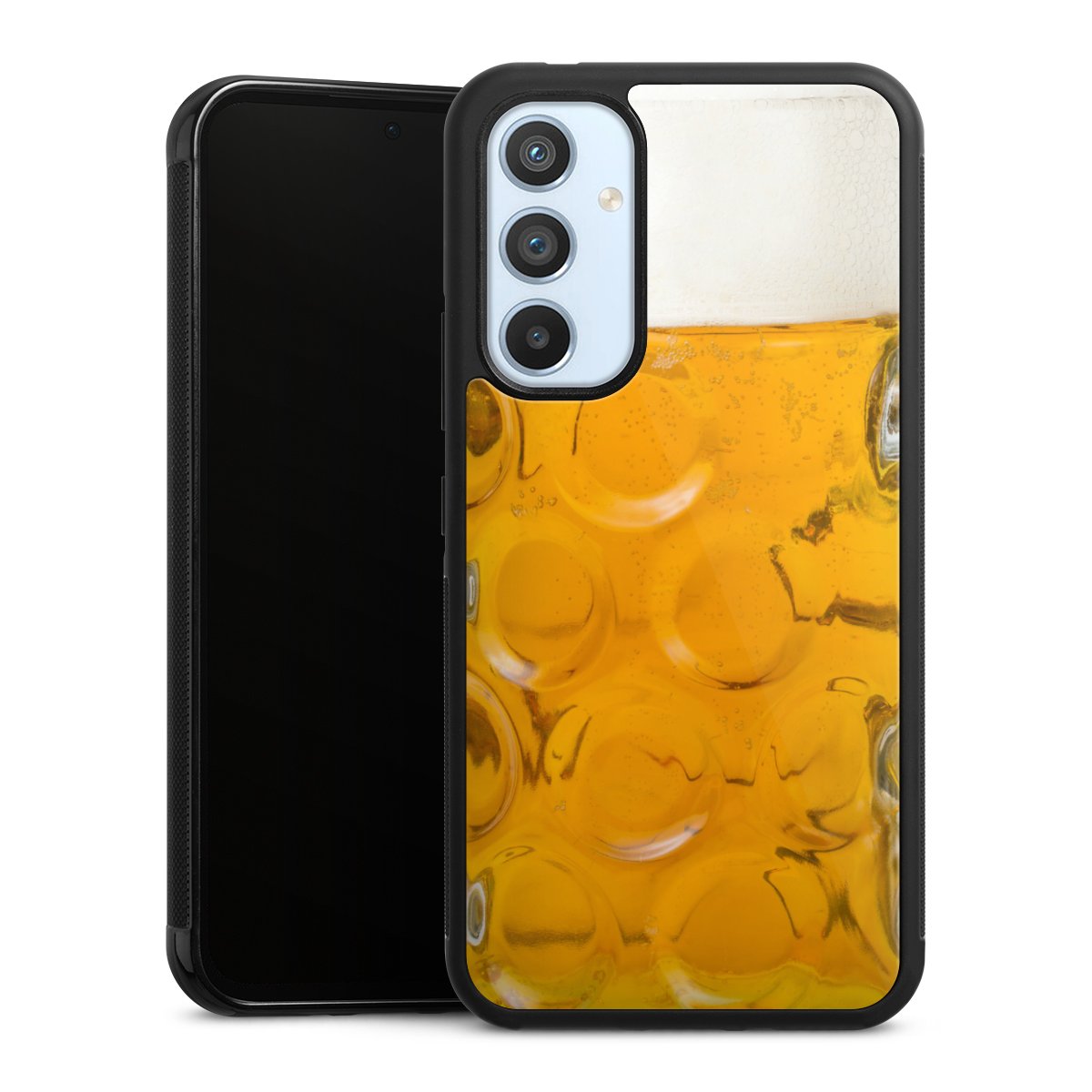 We print your design on the back of the glass inlay and then connect it firmly to the silicone case ,so that nothing sticks out and everything looks like it was cast from one piece. In addition, the sturdy glass element is protected from scratches by an additional coating and ensures a slight reflection on the shiny print image.