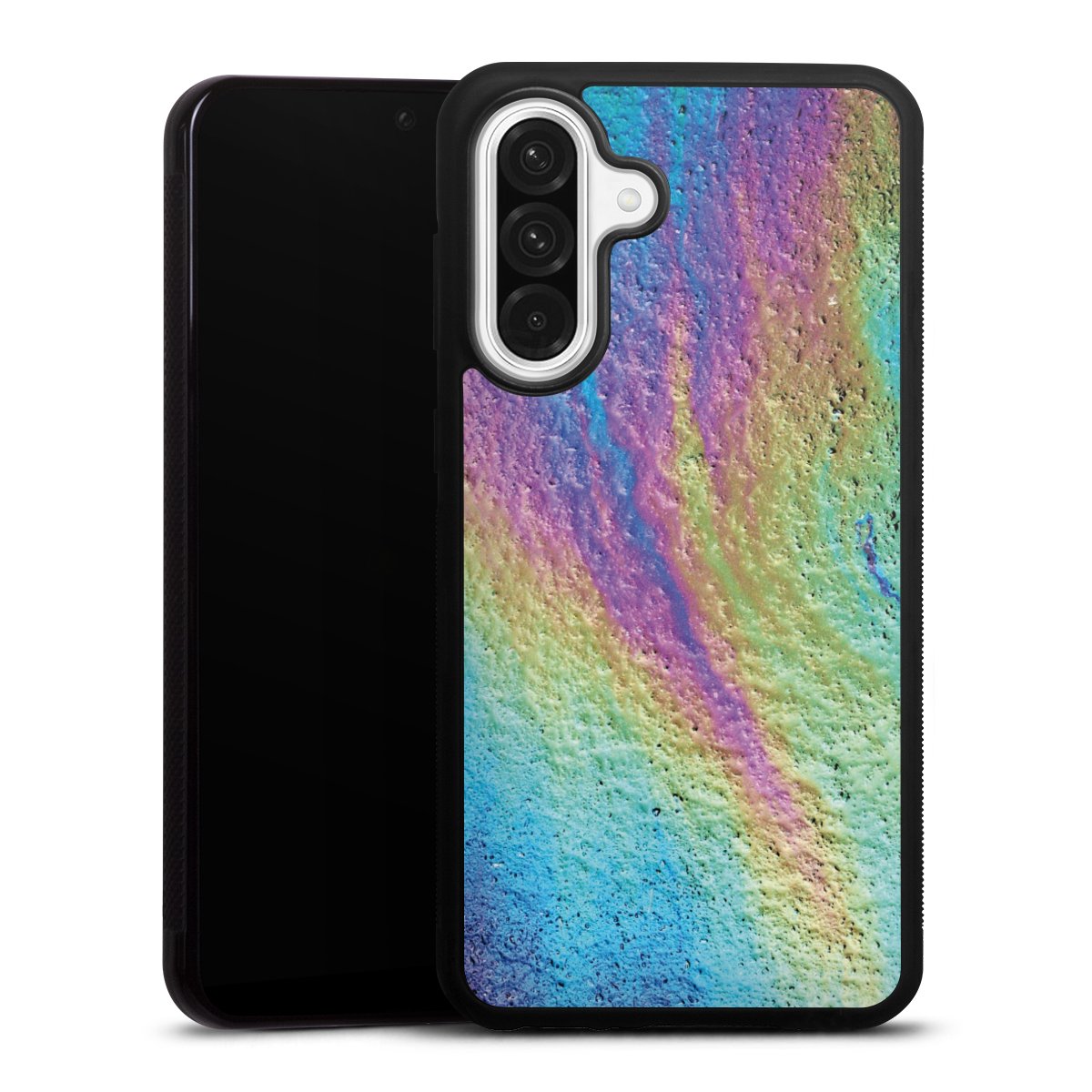 We print your design on the back of the glass inlay and then connect it firmly to the silicone case ,so that nothing sticks out and everything looks like it was cast from one piece. In addition, the sturdy glass element is protected from scratches by an additional coating and ensures a slight reflection on the shiny print image.