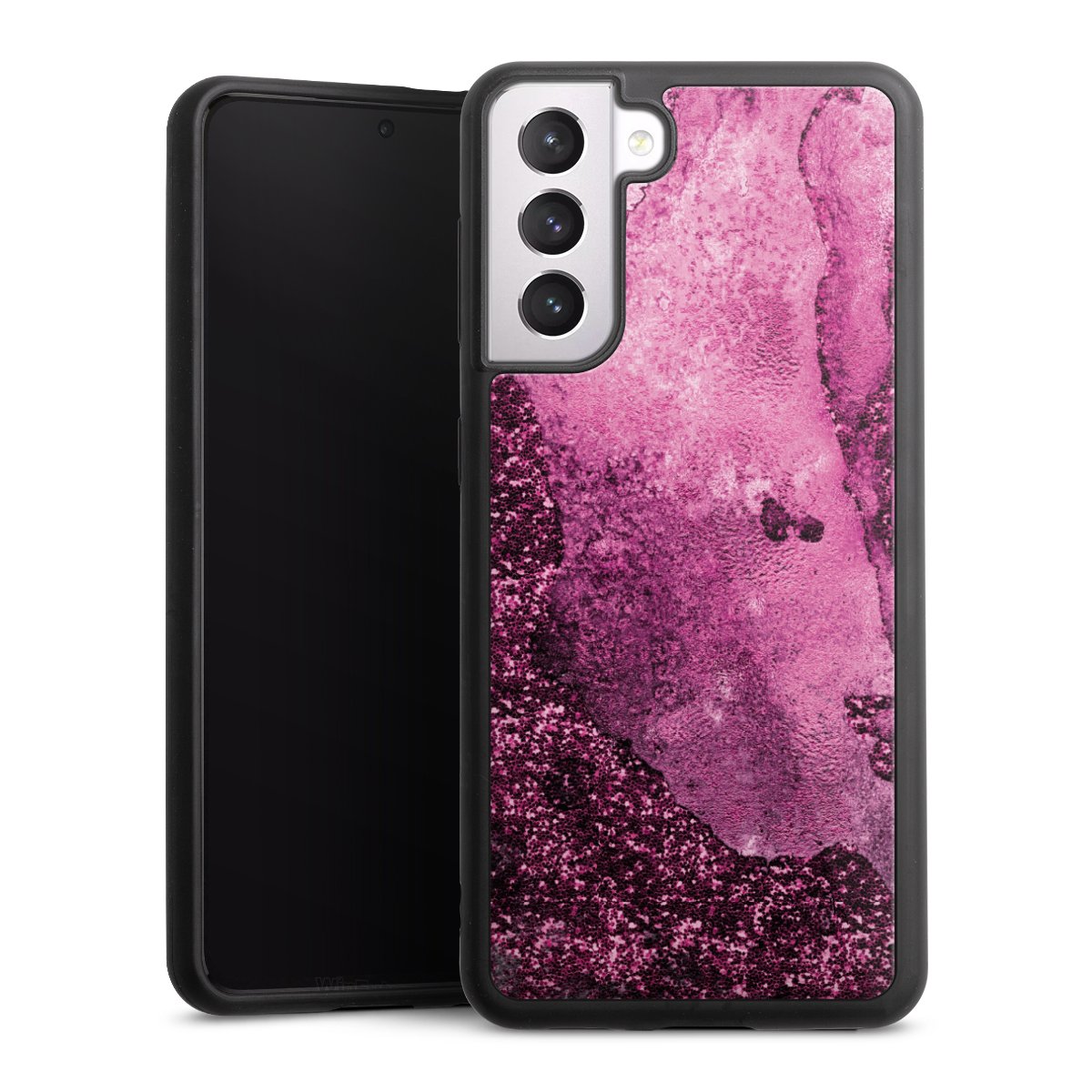 We print your design on the back of the glass inlay and then connect it firmly to the silicone case ,so that nothing sticks out and everything looks like it was cast from one piece. In addition, the sturdy glass element is protected from scratches by an additional coating and ensures a slight reflection on the shiny print image.