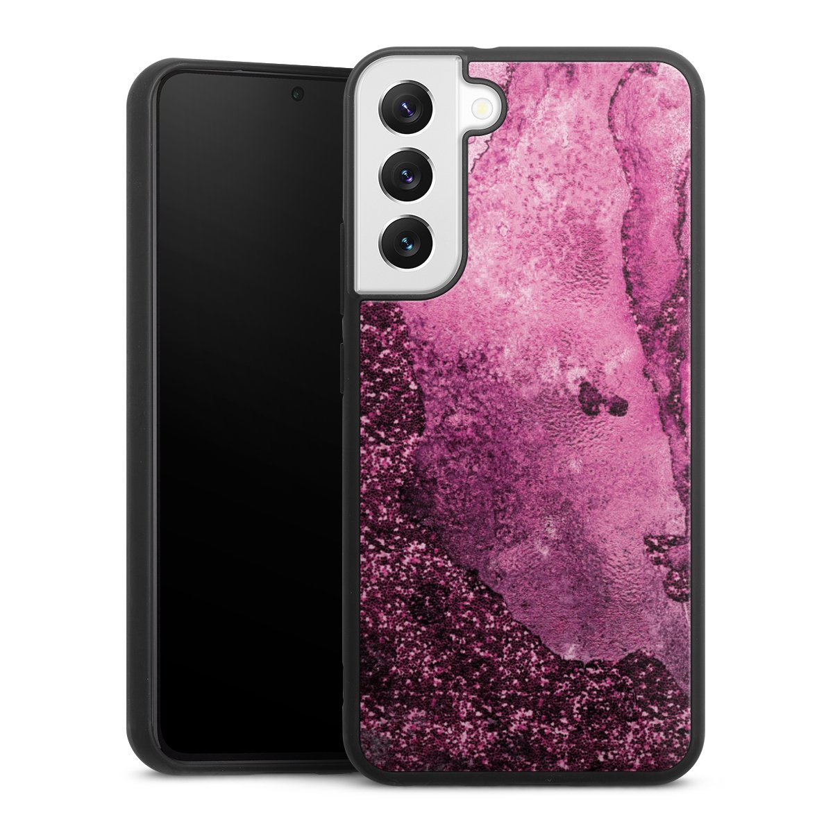 We print your design on the back of the glass inlay and then connect it firmly to the silicone case ,so that nothing sticks out and everything looks like it was cast from one piece. In addition, the sturdy glass element is protected from scratches by an additional coating and ensures a slight reflection on the shiny print image.