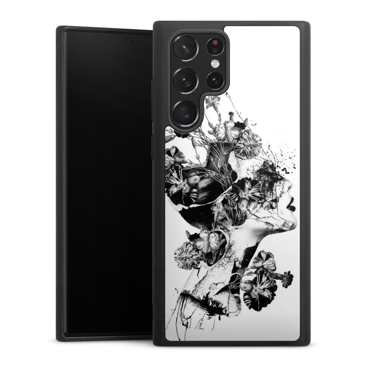 We print your design on the back of the glass inlay and then connect it firmly to the silicone case ,so that nothing sticks out and everything looks like it was cast from one piece. In addition, the sturdy glass element is protected from scratches by an additional coating and ensures a slight reflection on the shiny print image.