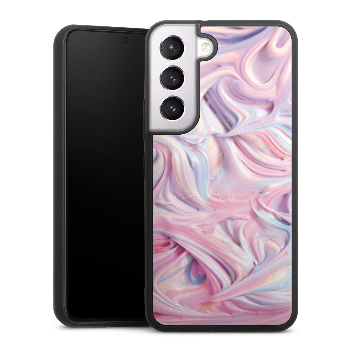 We print your design on the back of the glass inlay and then connect it firmly to the silicone case ,so that nothing sticks out and everything looks like it was cast from one piece. In addition, the sturdy glass element is protected from scratches by an additional coating and ensures a slight reflection on the shiny print image.
