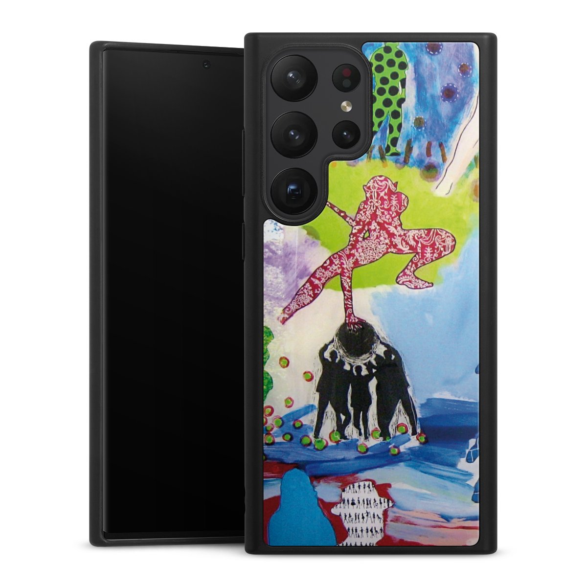 We print your design on the back of the glass inlay and then connect it firmly to the silicone case ,so that nothing sticks out and everything looks like it was cast from one piece. In addition, the sturdy glass element is protected from scratches by an additional coating and ensures a slight reflection on the shiny print image.
