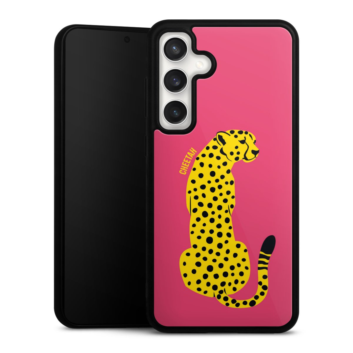 We print your design on the back of the glass inlay and then connect it firmly to the silicone case ,so that nothing sticks out and everything looks like it was cast from one piece. In addition, the sturdy glass element is protected from scratches by an additional coating and ensures a slight reflection on the shiny print image.
