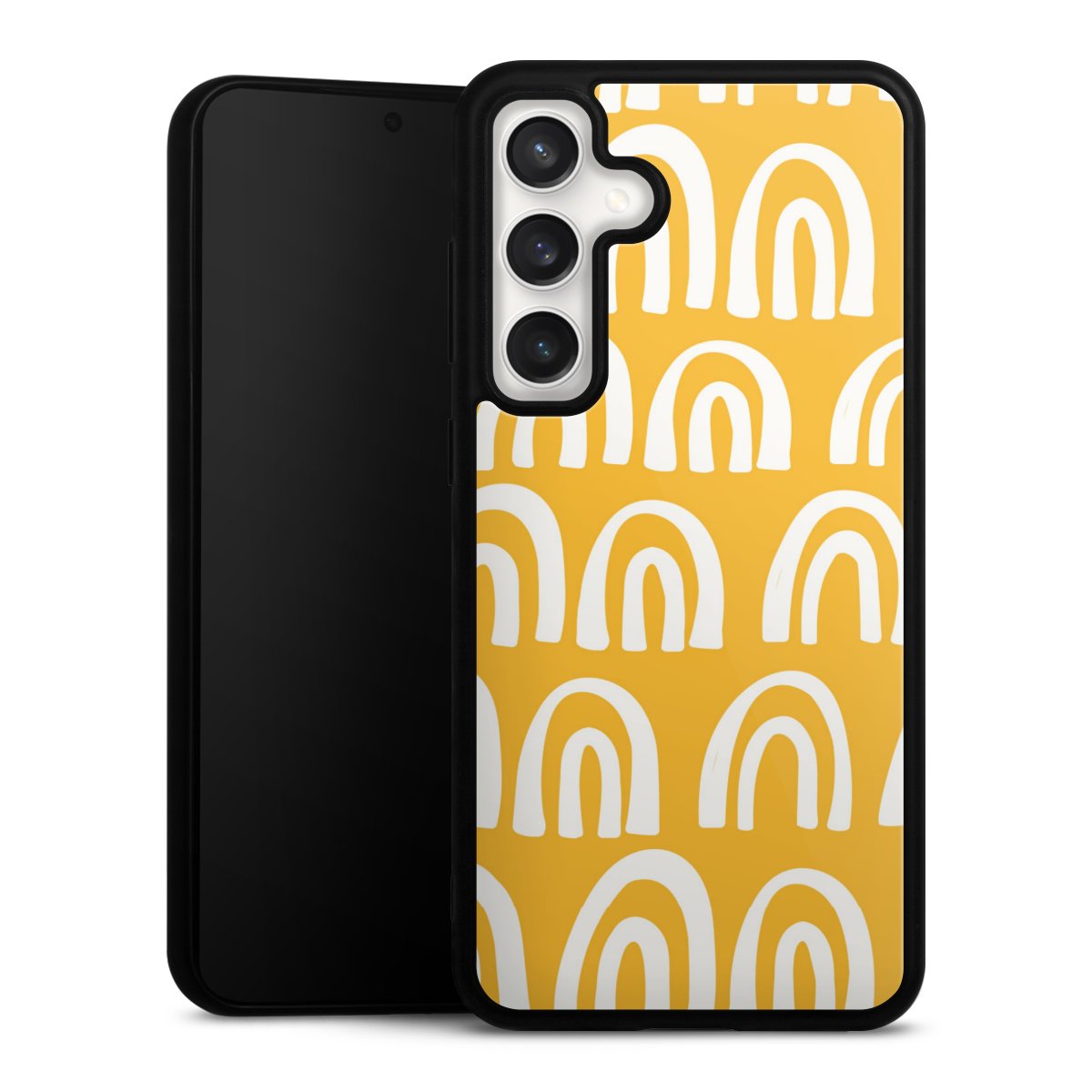 We print your design on the back of the glass inlay and then connect it firmly to the silicone case ,so that nothing sticks out and everything looks like it was cast from one piece. In addition, the sturdy glass element is protected from scratches by an additional coating and ensures a slight reflection on the shiny print image.