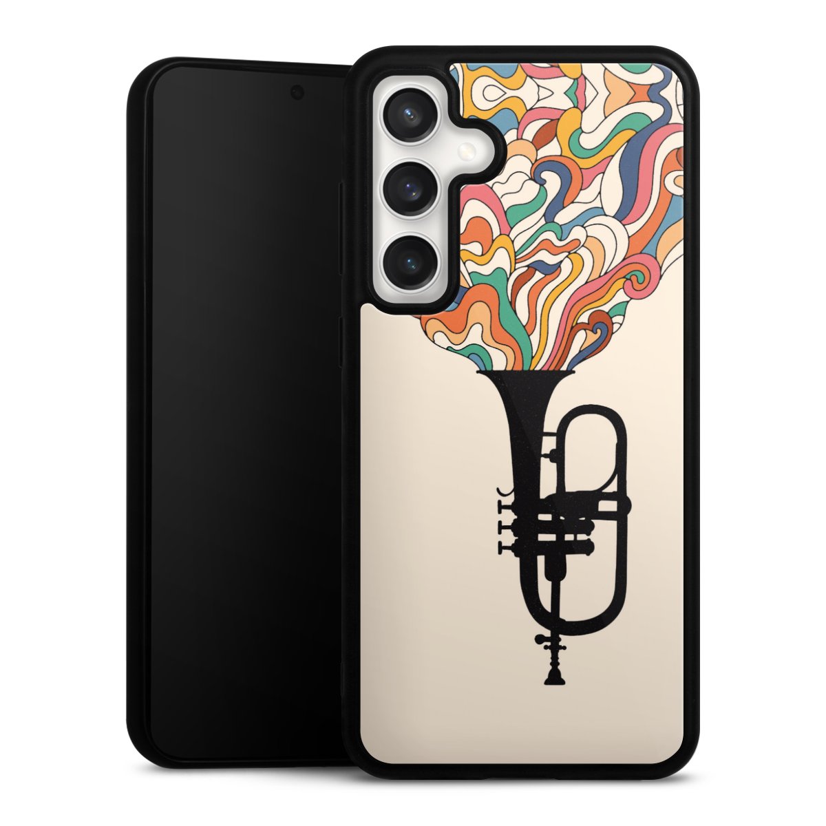 We print your design on the back of the glass inlay and then connect it firmly to the silicone case ,so that nothing sticks out and everything looks like it was cast from one piece. In addition, the sturdy glass element is protected from scratches by an additional coating and ensures a slight reflection on the shiny print image.