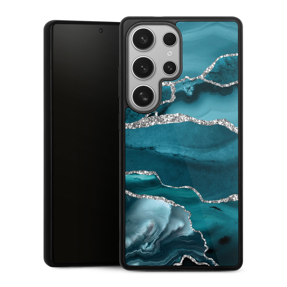 We print your design on the back of the glass inlay and then connect it firmly to the silicone case ,so that nothing sticks out and everything looks like it was cast from one piece. In addition, the sturdy glass element is protected from scratches by an additional coating and ensures a slight reflection on the shiny print image.