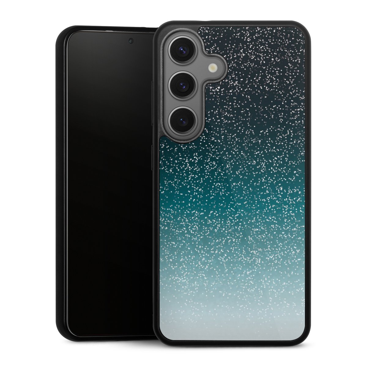We print your design on the back of the glass inlay and then connect it firmly to the silicone case ,so that nothing sticks out and everything looks like it was cast from one piece. In addition, the sturdy glass element is protected from scratches by an additional coating and ensures a slight reflection on the shiny print image.