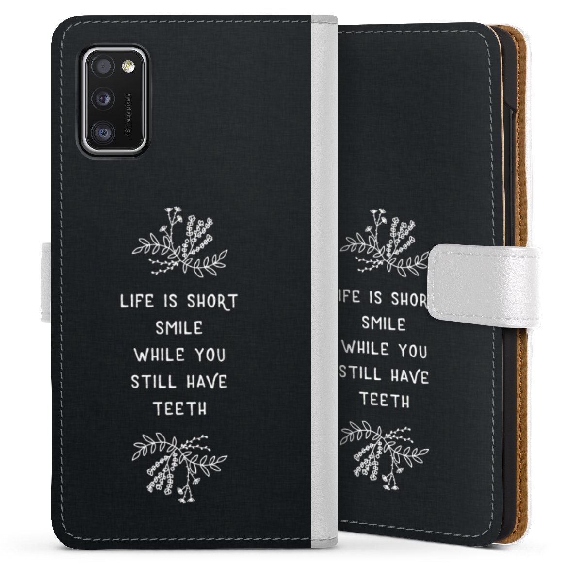For our Sideflip Case we are using our advanced direct printing technology. The back and frontside are fully printabale, the inside of the phone bag is left unprinted. You can order the phone case without print, printed completely or also with a partial print.