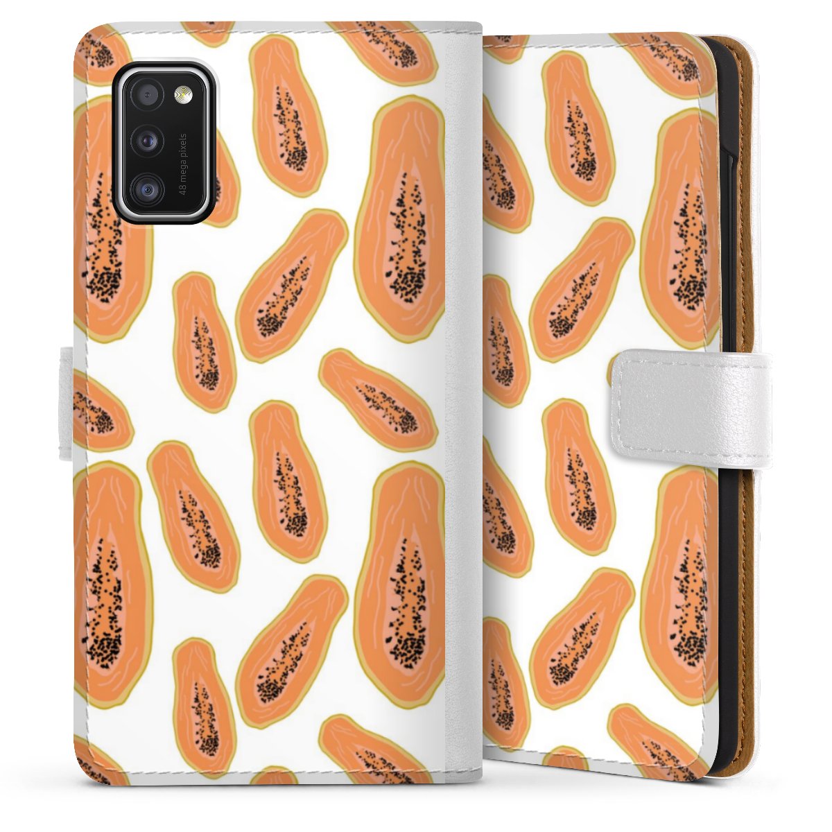 For our Sideflip Case we are using our advanced direct printing technology. The back and frontside are fully printabale, the inside of the phone bag is left unprinted. You can order the phone case without print, printed completely or also with a partial print.