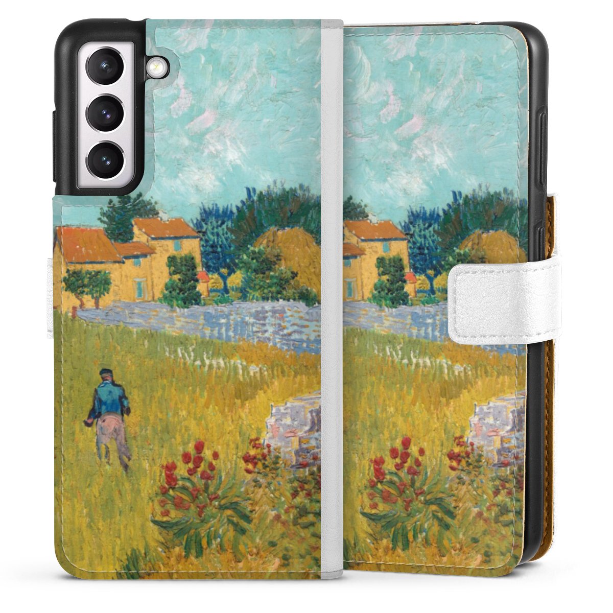 For our Sideflip Case we are using our advanced direct printing technology. The back and frontside are fully printabale, the inside of the phone bag is left unprinted. You can order the phone case without print, printed completely or also with a partial print.