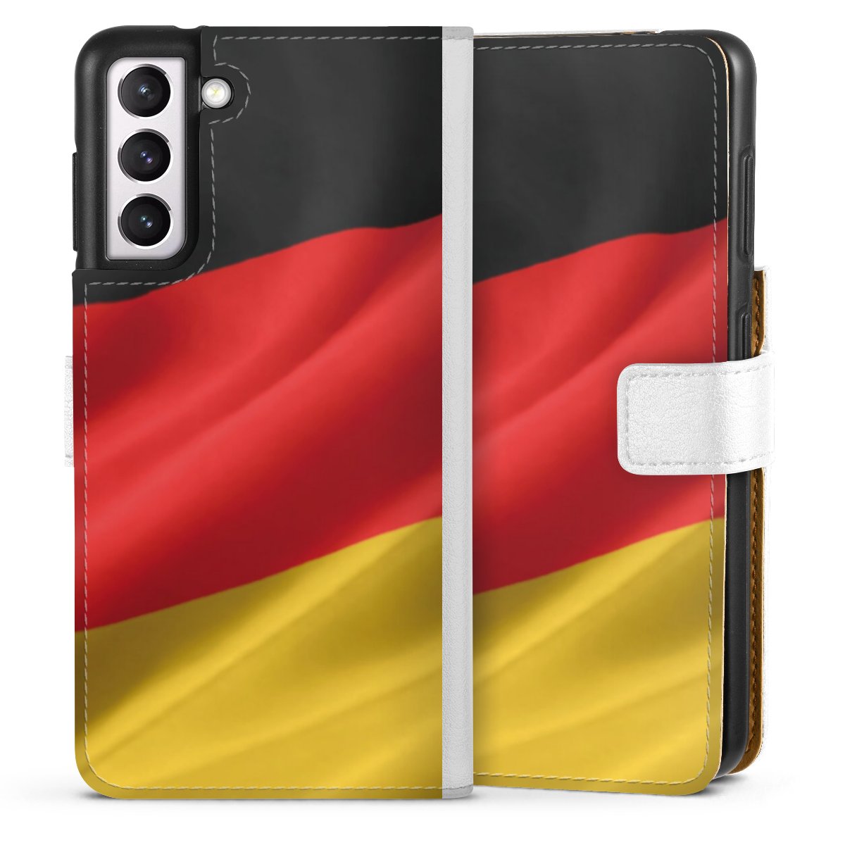 For our Sideflip Case we are using our advanced direct printing technology. The back and frontside are fully printabale, the inside of the phone bag is left unprinted. You can order the phone case without print, printed completely or also with a partial print.