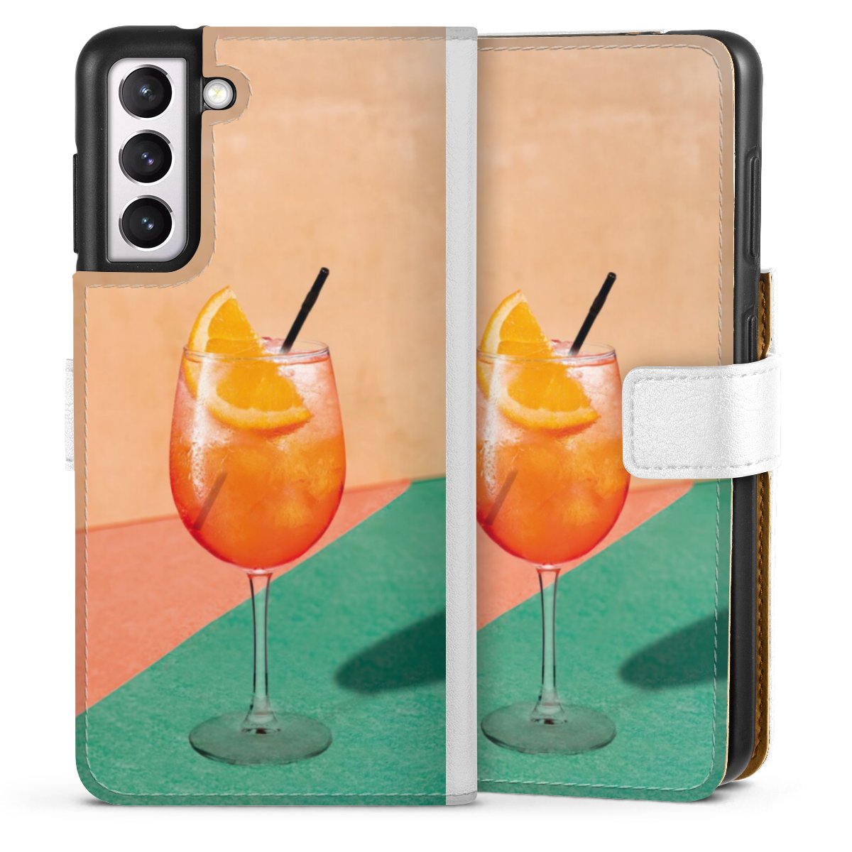 For our Sideflip Case we are using our advanced direct printing technology. The back and frontside are fully printabale, the inside of the phone bag is left unprinted. You can order the phone case without print, printed completely or also with a partial print.