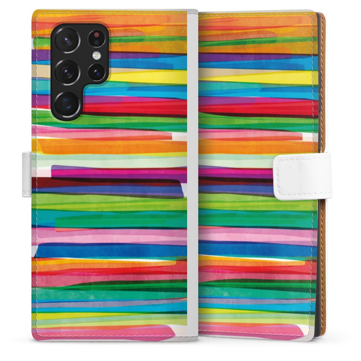 For our Sideflip Case we are using our advanced direct printing technology. The back and frontside are fully printabale, the inside of the phone bag is left unprinted. You can order the phone case without print, printed completely or also with a partial print.