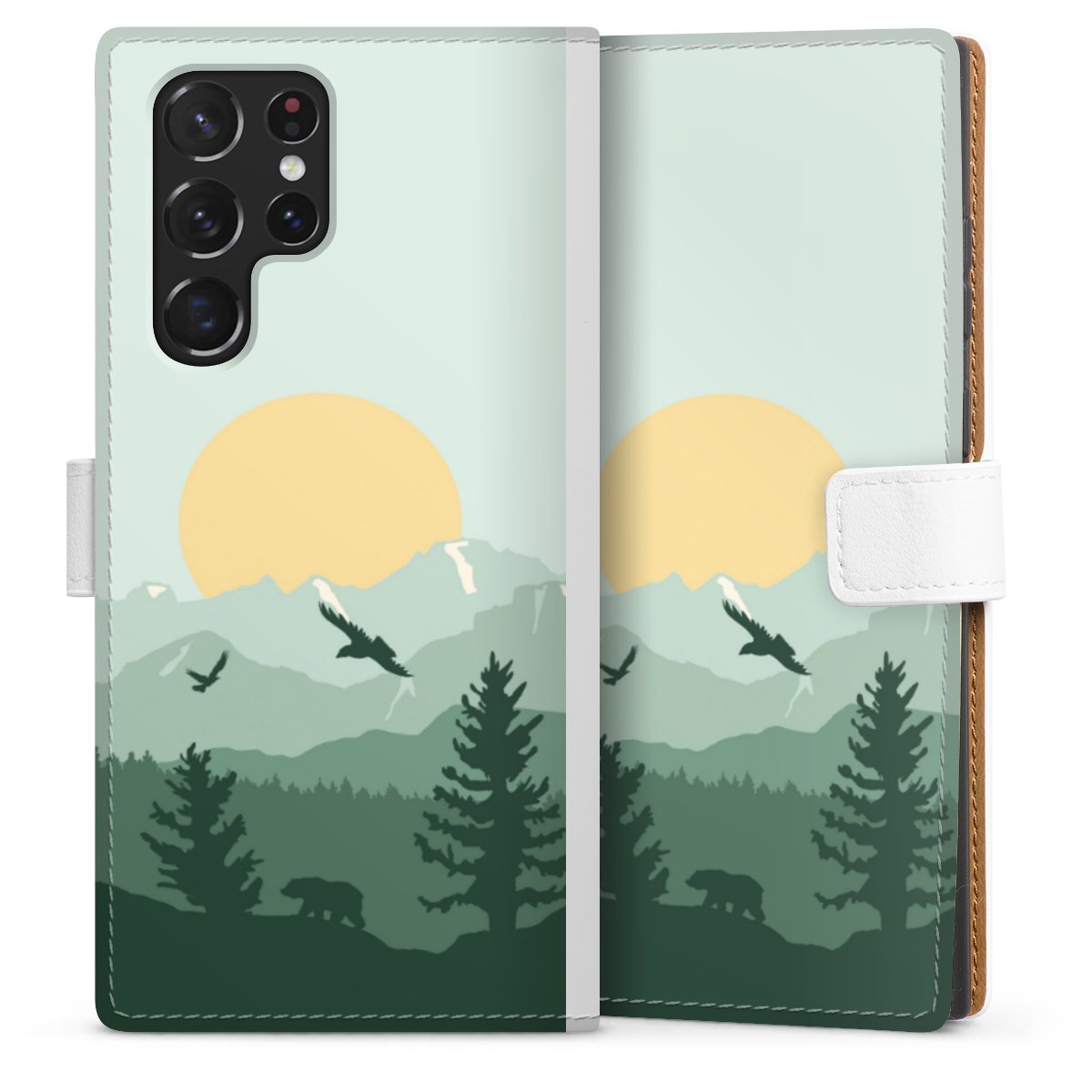 For our Sideflip Case we are using our advanced direct printing technology. The back and frontside are fully printabale, the inside of the phone bag is left unprinted. You can order the phone case without print, printed completely or also with a partial print.
