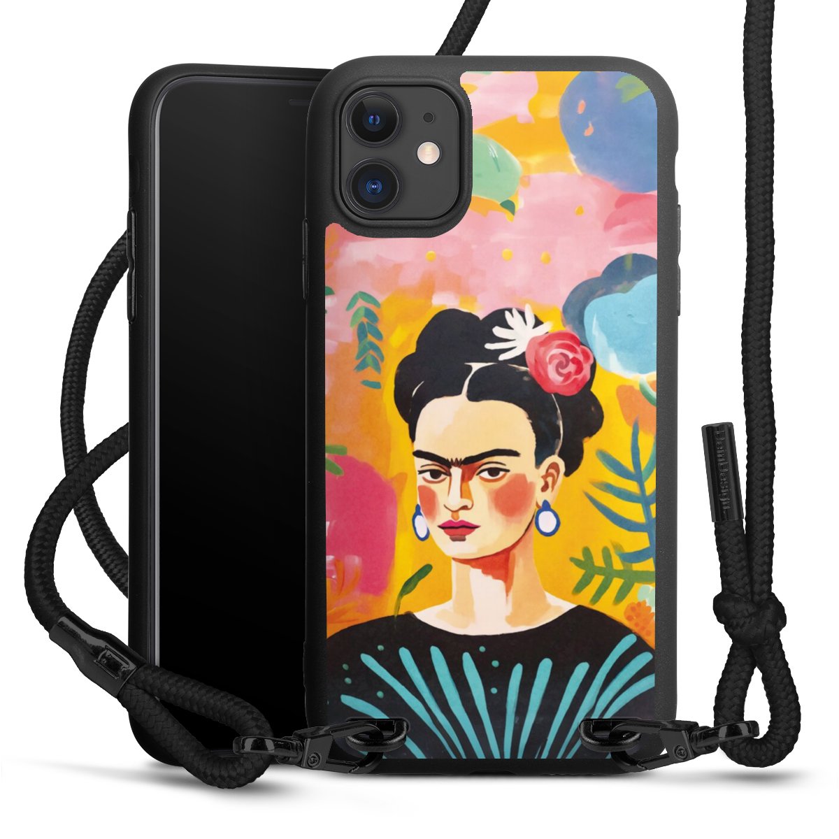 The matt black silicone case is made of flexible TPU (thermoplastic polyurethane) and offers robust protection. The durable, unbreakable material makes the cover flexible and dimensionally stable at the same time. The matte surface makes your design stand out more and is less susceptible to fingerprints and dirt. The stylish trend accessory fits comfortably in the hand and is perfectly complemented by the fabric (polyester) mobile phone strap. The braided fabric strap is approx. 1.70 metres long with a diameter of approx. 0.5 cm. Due to the special knotting technique, the length of the strap can be adjusted by simply pulling it, so that you can adapt it individually to your wishes. The practical case to wear around your neck is available with the fabric strap in black. As a little icing on the cake, we have provided the strap with a chic metal fastener in matt black. The strap is securely fastened to the case with loops made of high-quality genuine leather and press studs. The ends of the fabric strap are covered with metallic end caps and thus protected from fraying.