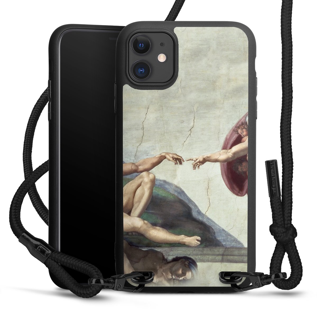 The matt black silicone case is made of flexible TPU (thermoplastic polyurethane) and offers robust protection. The durable, unbreakable material makes the cover flexible and dimensionally stable at the same time. The matte surface makes your design stand out more and is less susceptible to fingerprints and dirt. The stylish trend accessory fits comfortably in the hand and is perfectly complemented by the fabric (polyester) mobile phone strap. The braided fabric strap is approx. 1.70 metres long with a diameter of approx. 0.5 cm. Due to the special knotting technique, the length of the strap can be adjusted by simply pulling it, so that you can adapt it individually to your wishes. The practical case to wear around your neck is available with the fabric strap in black. As a little icing on the cake, we have provided the strap with a chic metal fastener in matt black. The strap is securely fastened to the case with loops made of high-quality genuine leather and press studs. The ends of the fabric strap are covered with metallic end caps and thus protected from fraying.