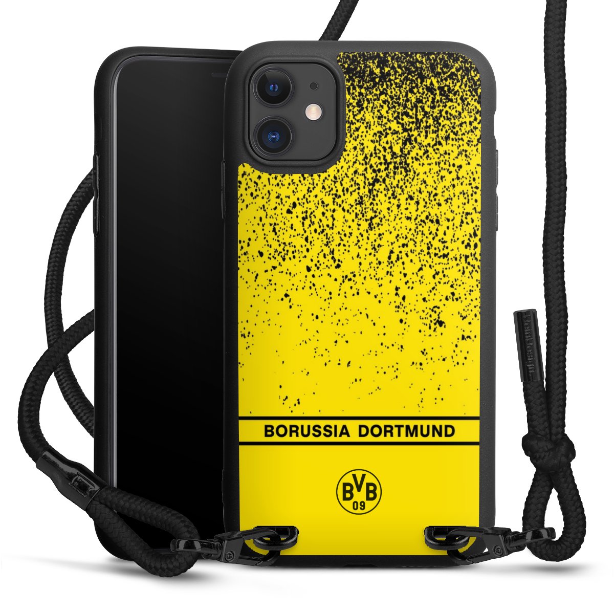 The matt black silicone case is made of flexible TPU (thermoplastic polyurethane) and offers robust protection. The durable, unbreakable material makes the cover flexible and dimensionally stable at the same time. The matte surface makes your design stand out more and is less susceptible to fingerprints and dirt. The stylish trend accessory fits comfortably in the hand and is perfectly complemented by the fabric (polyester) mobile phone strap. The braided fabric strap is approx. 1.70 metres long with a diameter of approx. 0.5 cm. Due to the special knotting technique, the length of the strap can be adjusted by simply pulling it, so that you can adapt it individually to your wishes. The practical case to wear around your neck is available with the fabric strap in black. As a little icing on the cake, we have provided the strap with a chic metal fastener in matt black. The strap is securely fastened to the case with loops made of high-quality genuine leather and press studs. The ends of the fabric strap are covered with metallic end caps and thus protected from fraying.