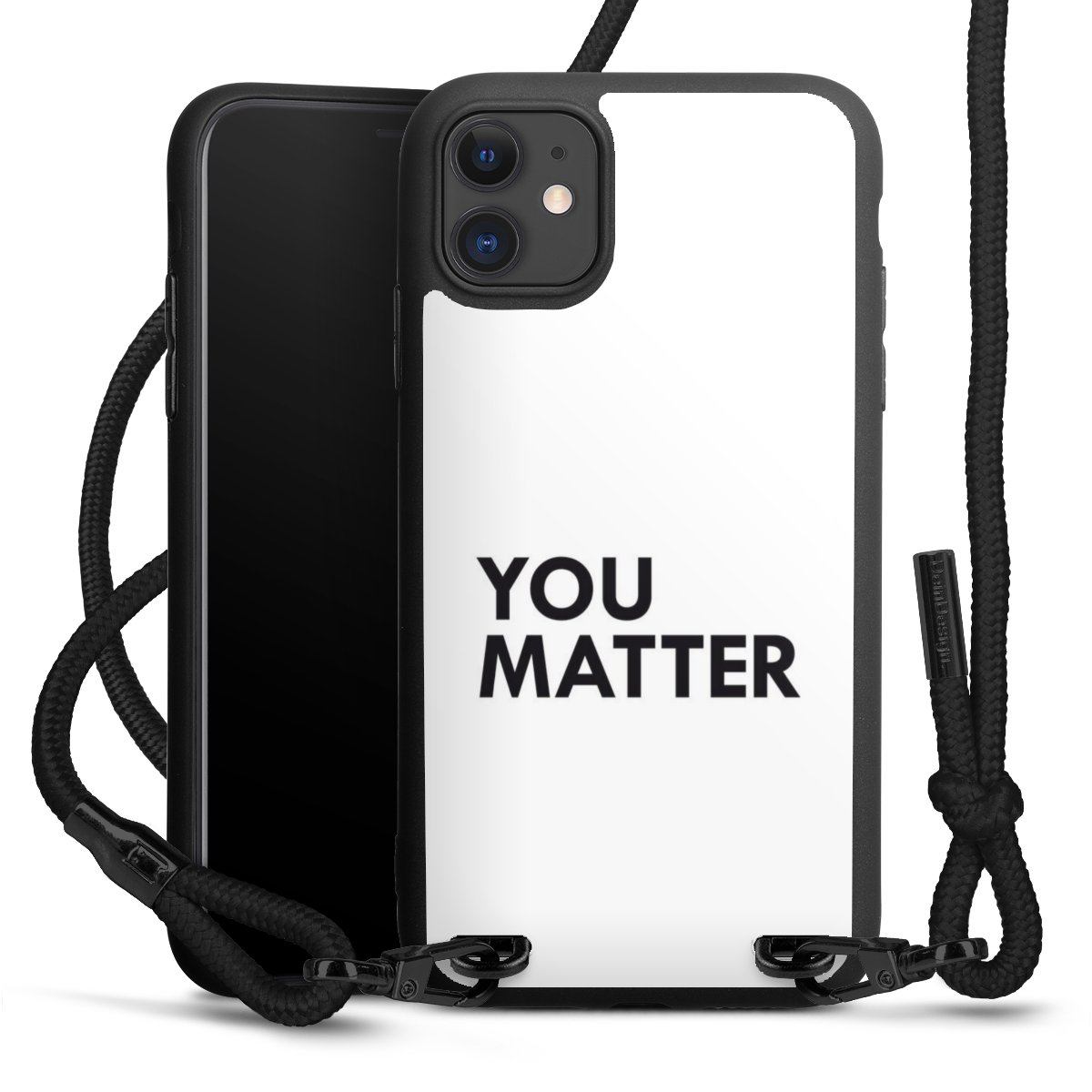 The matt black silicone case is made of flexible TPU (thermoplastic polyurethane) and offers robust protection. The durable, unbreakable material makes the cover flexible and dimensionally stable at the same time. The matte surface makes your design stand out more and is less susceptible to fingerprints and dirt. The stylish trend accessory fits comfortably in the hand and is perfectly complemented by the fabric (polyester) mobile phone strap. The braided fabric strap is approx. 1.70 metres long with a diameter of approx. 0.5 cm. Due to the special knotting technique, the length of the strap can be adjusted by simply pulling it, so that you can adapt it individually to your wishes. The practical case to wear around your neck is available with the fabric strap in black. As a little icing on the cake, we have provided the strap with a chic metal fastener in matt black. The strap is securely fastened to the case with loops made of high-quality genuine leather and press studs. The ends of the fabric strap are covered with metallic end caps and thus protected from fraying.