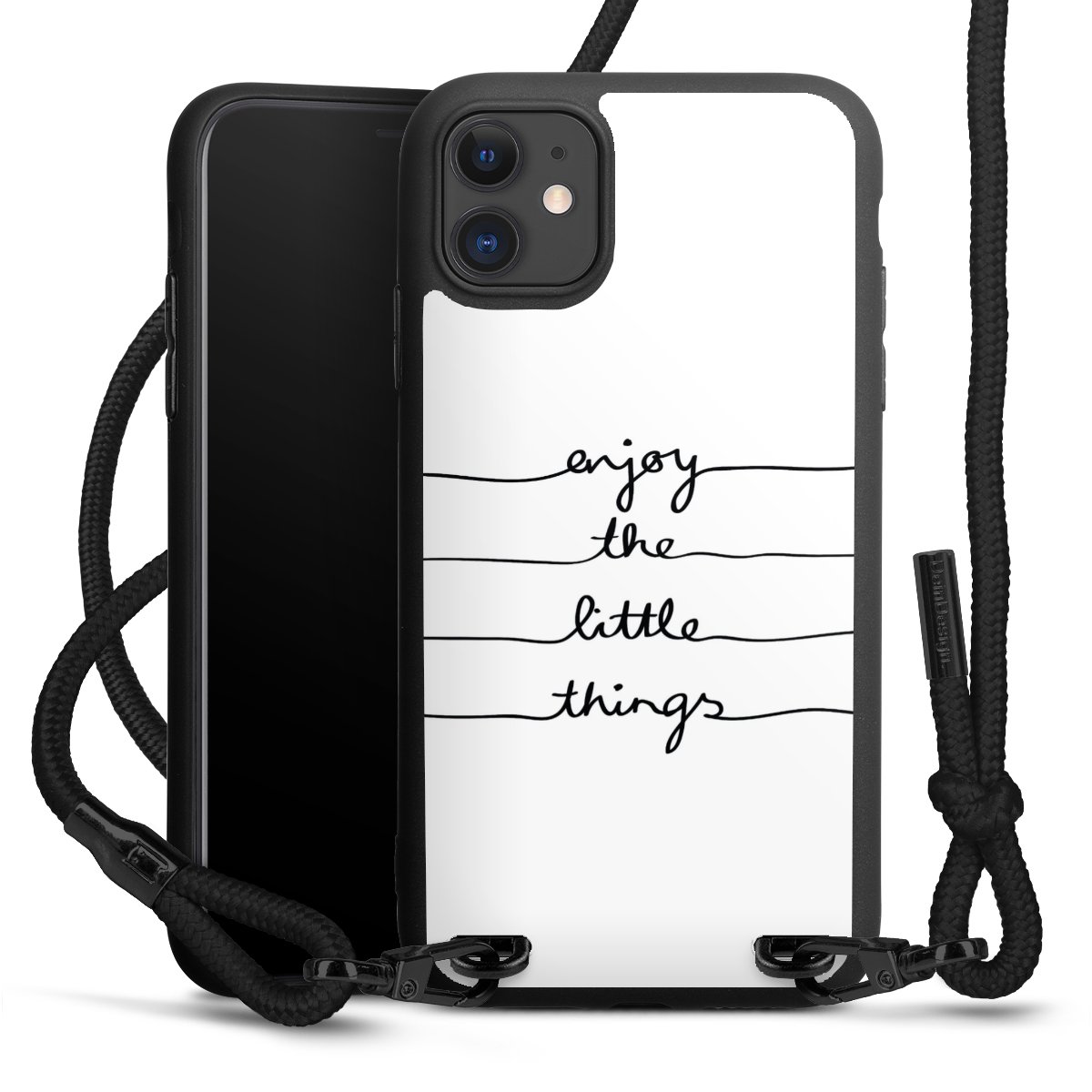 The matt black silicone case is made of flexible TPU (thermoplastic polyurethane) and offers robust protection. The durable, unbreakable material makes the cover flexible and dimensionally stable at the same time. The matte surface makes your design stand out more and is less susceptible to fingerprints and dirt. The stylish trend accessory fits comfortably in the hand and is perfectly complemented by the fabric (polyester) mobile phone strap. The braided fabric strap is approx. 1.70 metres long with a diameter of approx. 0.5 cm. Due to the special knotting technique, the length of the strap can be adjusted by simply pulling it, so that you can adapt it individually to your wishes. The practical case to wear around your neck is available with the fabric strap in black. As a little icing on the cake, we have provided the strap with a chic metal fastener in matt black. The strap is securely fastened to the case with loops made of high-quality genuine leather and press studs. The ends of the fabric strap are covered with metallic end caps and thus protected from fraying.
