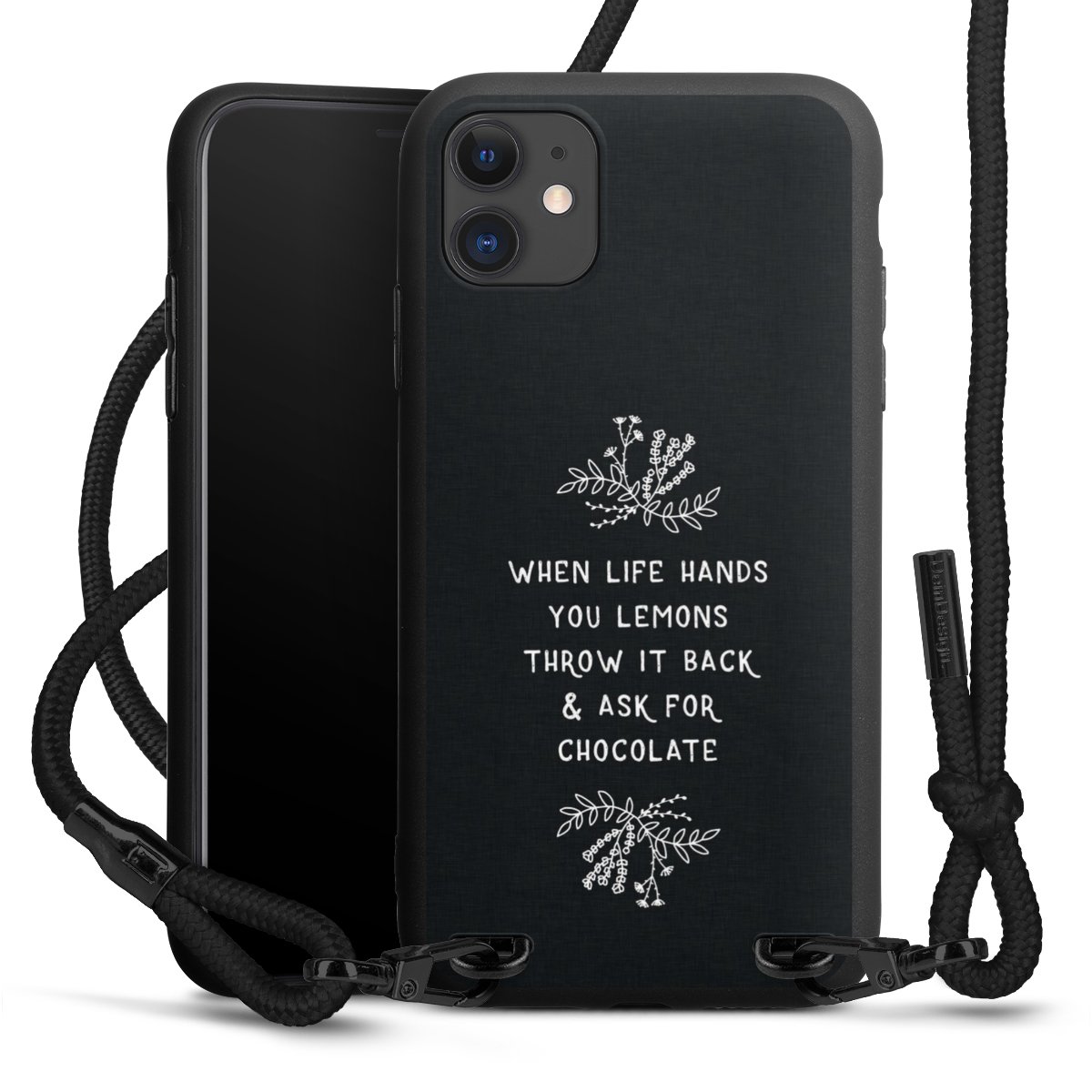 Pure Black: Phone case, fabric strap and metal details in stylish matt black.