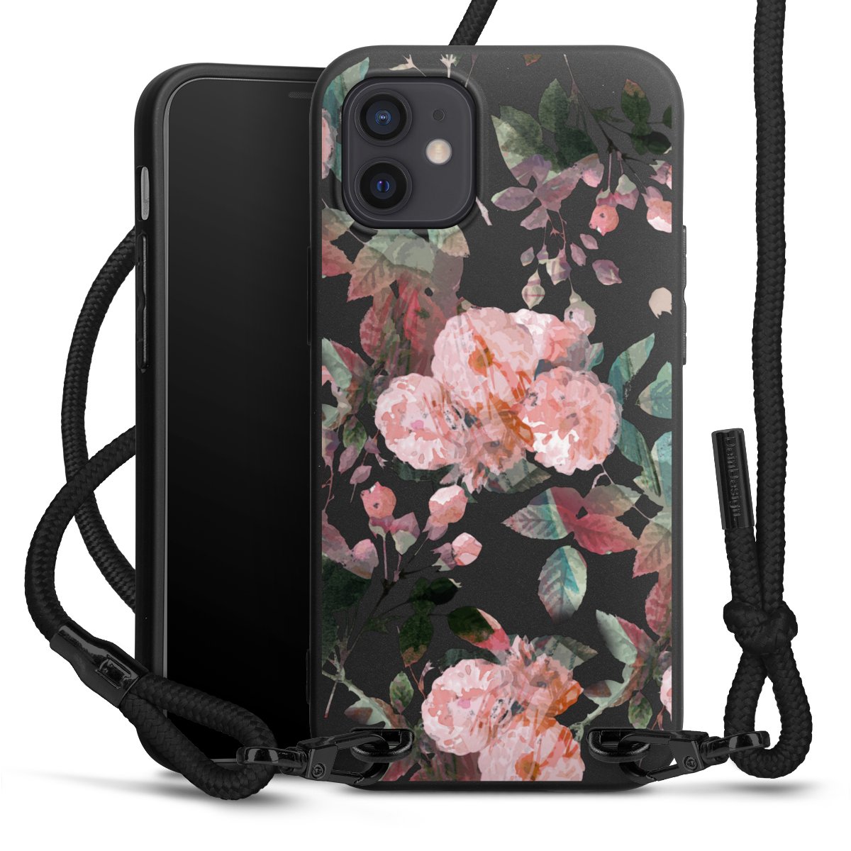The matt black silicone case is made of flexible TPU (thermoplastic polyurethane) and offers robust protection. The durable, unbreakable material makes the cover flexible and dimensionally stable at the same time. The matte surface makes your design stand out more and is less susceptible to fingerprints and dirt. The stylish trend accessory fits comfortably in the hand and is perfectly complemented by the fabric (polyester) mobile phone strap. The braided fabric strap is approx. 1.70 metres long with a diameter of approx. 0.5 cm. Due to the special knotting technique, the length of the strap can be adjusted by simply pulling it, so that you can adapt it individually to your wishes. The practical case to wear around your neck is available with the fabric strap in black. As a little icing on the cake, we have provided the strap with a chic metal fastener in matt black. The strap is securely fastened to the case with loops made of high-quality genuine leather and press studs. The ends of the fabric strap are covered with metallic end caps and thus protected from fraying.
