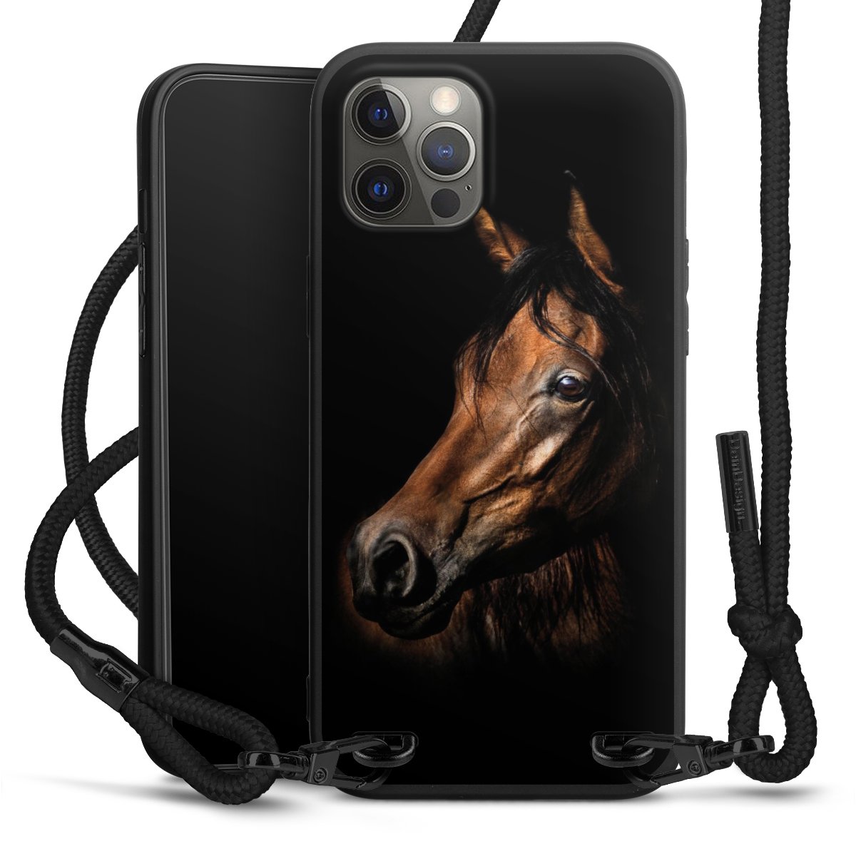 The matt black silicone case is made of flexible TPU (thermoplastic polyurethane) and offers robust protection. The durable, unbreakable material makes the cover flexible and dimensionally stable at the same time. The matte surface makes your design stand out more and is less susceptible to fingerprints and dirt. The stylish trend accessory fits comfortably in the hand and is perfectly complemented by the fabric (polyester) mobile phone strap. The braided fabric strap is approx. 1.70 metres long with a diameter of approx. 0.5 cm. Due to the special knotting technique, the length of the strap can be adjusted by simply pulling it, so that you can adapt it individually to your wishes. The practical case to wear around your neck is available with the fabric strap in black. As a little icing on the cake, we have provided the strap with a chic metal fastener in matt black. The strap is securely fastened to the case with loops made of high-quality genuine leather and press studs. The ends of the fabric strap are covered with metallic end caps and thus protected from fraying.