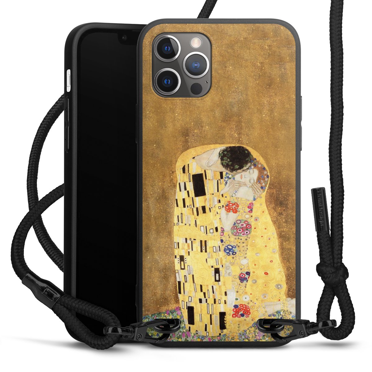 The matt black silicone case is made of flexible TPU (thermoplastic polyurethane) and offers robust protection. The durable, unbreakable material makes the cover flexible and dimensionally stable at the same time. The matte surface makes your design stand out more and is less susceptible to fingerprints and dirt. The stylish trend accessory fits comfortably in the hand and is perfectly complemented by the fabric (polyester) mobile phone strap. The braided fabric strap is approx. 1.70 metres long with a diameter of approx. 0.5 cm. Due to the special knotting technique, the length of the strap can be adjusted by simply pulling it, so that you can adapt it individually to your wishes. The practical case to wear around your neck is available with the fabric strap in black. As a little icing on the cake, we have provided the strap with a chic metal fastener in matt black. The strap is securely fastened to the case with loops made of high-quality genuine leather and press studs. The ends of the fabric strap are covered with metallic end caps and thus protected from fraying.