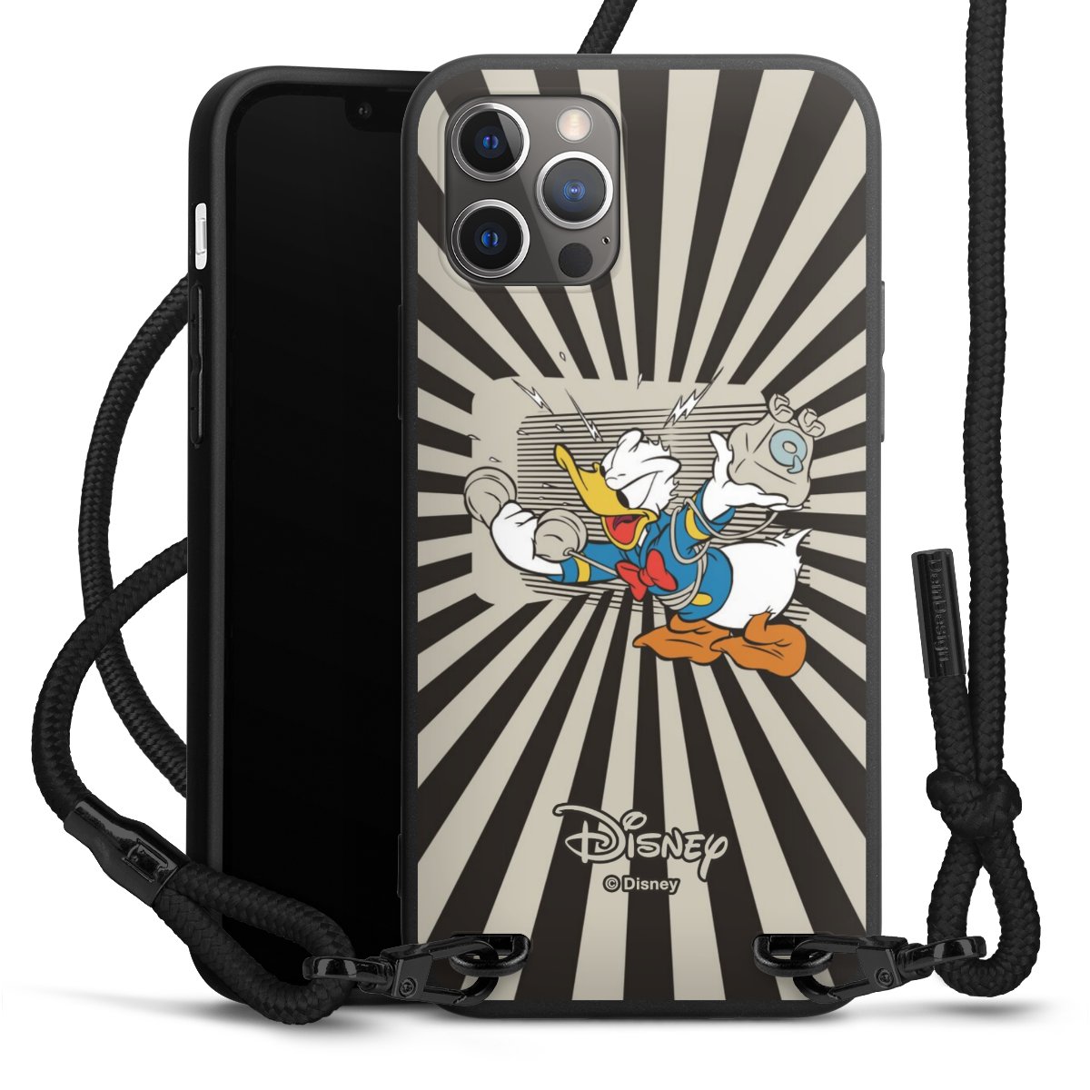 Pure Black: Phone case, fabric strap and metal details in stylish matt black.