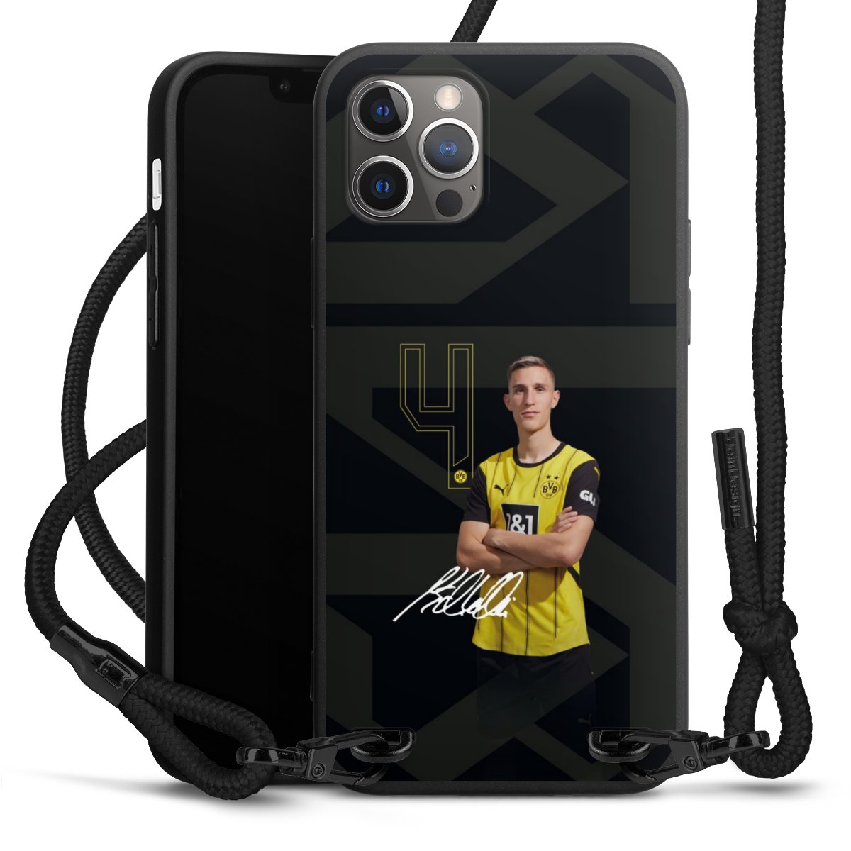 The matt black silicone case is made of flexible TPU (thermoplastic polyurethane) and offers robust protection. The durable, unbreakable material makes the cover flexible and dimensionally stable at the same time. The matte surface makes your design stand out more and is less susceptible to fingerprints and dirt. The stylish trend accessory fits comfortably in the hand and is perfectly complemented by the fabric (polyester) mobile phone strap. The braided fabric strap is approx. 1.70 metres long with a diameter of approx. 0.5 cm. Due to the special knotting technique, the length of the strap can be adjusted by simply pulling it, so that you can adapt it individually to your wishes. The practical case to wear around your neck is available with the fabric strap in black. As a little icing on the cake, we have provided the strap with a chic metal fastener in matt black. The strap is securely fastened to the case with loops made of high-quality genuine leather and press studs. The ends of the fabric strap are covered with metallic end caps and thus protected from fraying.