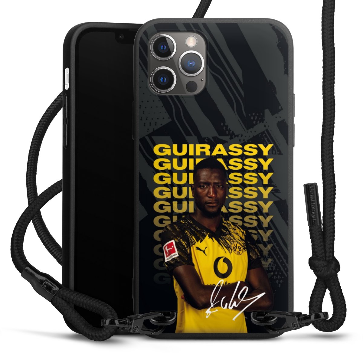 Pure Black: Phone case, fabric strap and metal details in stylish matt black.