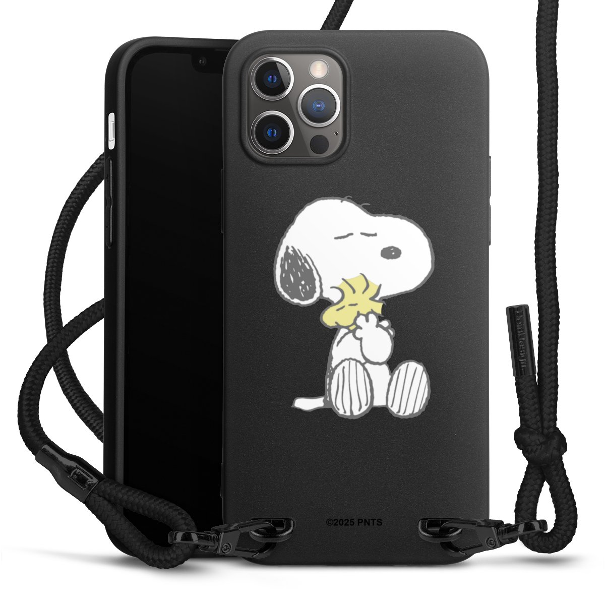 The matt black silicone case is made of flexible TPU (thermoplastic polyurethane) and offers robust protection. The durable, unbreakable material makes the cover flexible and dimensionally stable at the same time. The matte surface makes your design stand out more and is less susceptible to fingerprints and dirt. The stylish trend accessory fits comfortably in the hand and is perfectly complemented by the fabric (polyester) mobile phone strap. The braided fabric strap is approx. 1.70 metres long with a diameter of approx. 0.5 cm. Due to the special knotting technique, the length of the strap can be adjusted by simply pulling it, so that you can adapt it individually to your wishes. The practical case to wear around your neck is available with the fabric strap in black. As a little icing on the cake, we have provided the strap with a chic metal fastener in matt black. The strap is securely fastened to the case with loops made of high-quality genuine leather and press studs. The ends of the fabric strap are covered with metallic end caps and thus protected from fraying.