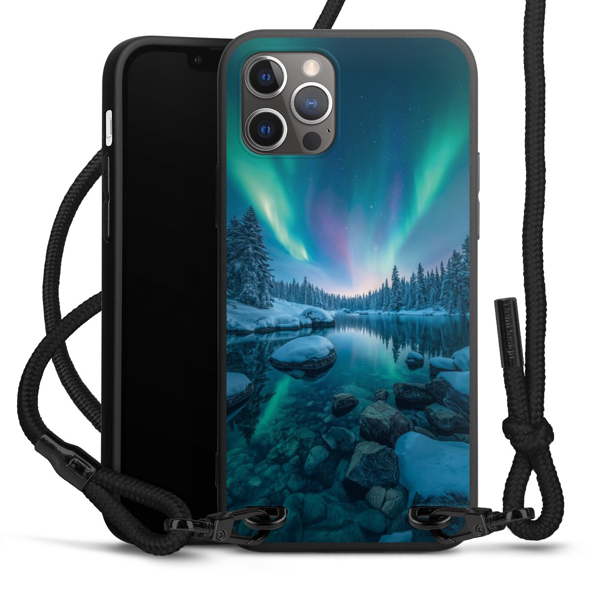 The matt black silicone case is made of flexible TPU (thermoplastic polyurethane) and offers robust protection. The durable, unbreakable material makes the cover flexible and dimensionally stable at the same time. The matte surface makes your design stand out more and is less susceptible to fingerprints and dirt. The stylish trend accessory fits comfortably in the hand and is perfectly complemented by the fabric (polyester) mobile phone strap. The braided fabric strap is approx. 1.70 metres long with a diameter of approx. 0.5 cm. Due to the special knotting technique, the length of the strap can be adjusted by simply pulling it, so that you can adapt it individually to your wishes. The practical case to wear around your neck is available with the fabric strap in black. As a little icing on the cake, we have provided the strap with a chic metal fastener in matt black. The strap is securely fastened to the case with loops made of high-quality genuine leather and press studs. The ends of the fabric strap are covered with metallic end caps and thus protected from fraying.