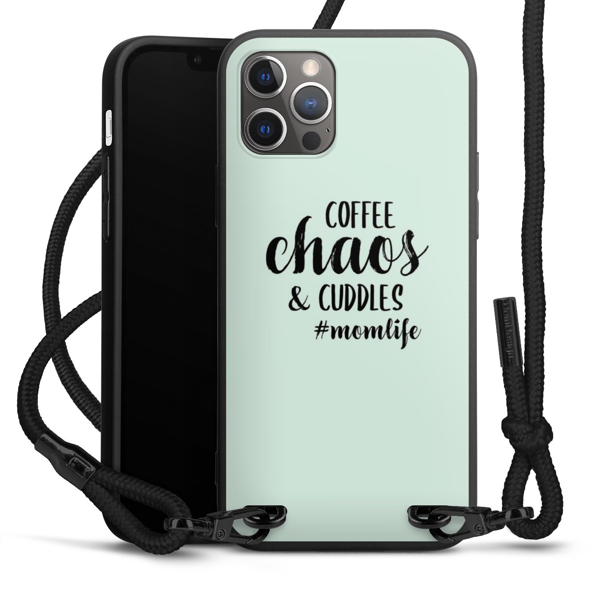 The matt black silicone case is made of flexible TPU (thermoplastic polyurethane) and offers robust protection. The durable, unbreakable material makes the cover flexible and dimensionally stable at the same time. The matte surface makes your design stand out more and is less susceptible to fingerprints and dirt. The stylish trend accessory fits comfortably in the hand and is perfectly complemented by the fabric (polyester) mobile phone strap. The braided fabric strap is approx. 1.70 metres long with a diameter of approx. 0.5 cm. Due to the special knotting technique, the length of the strap can be adjusted by simply pulling it, so that you can adapt it individually to your wishes. The practical case to wear around your neck is available with the fabric strap in black. As a little icing on the cake, we have provided the strap with a chic metal fastener in matt black. The strap is securely fastened to the case with loops made of high-quality genuine leather and press studs. The ends of the fabric strap are covered with metallic end caps and thus protected from fraying.