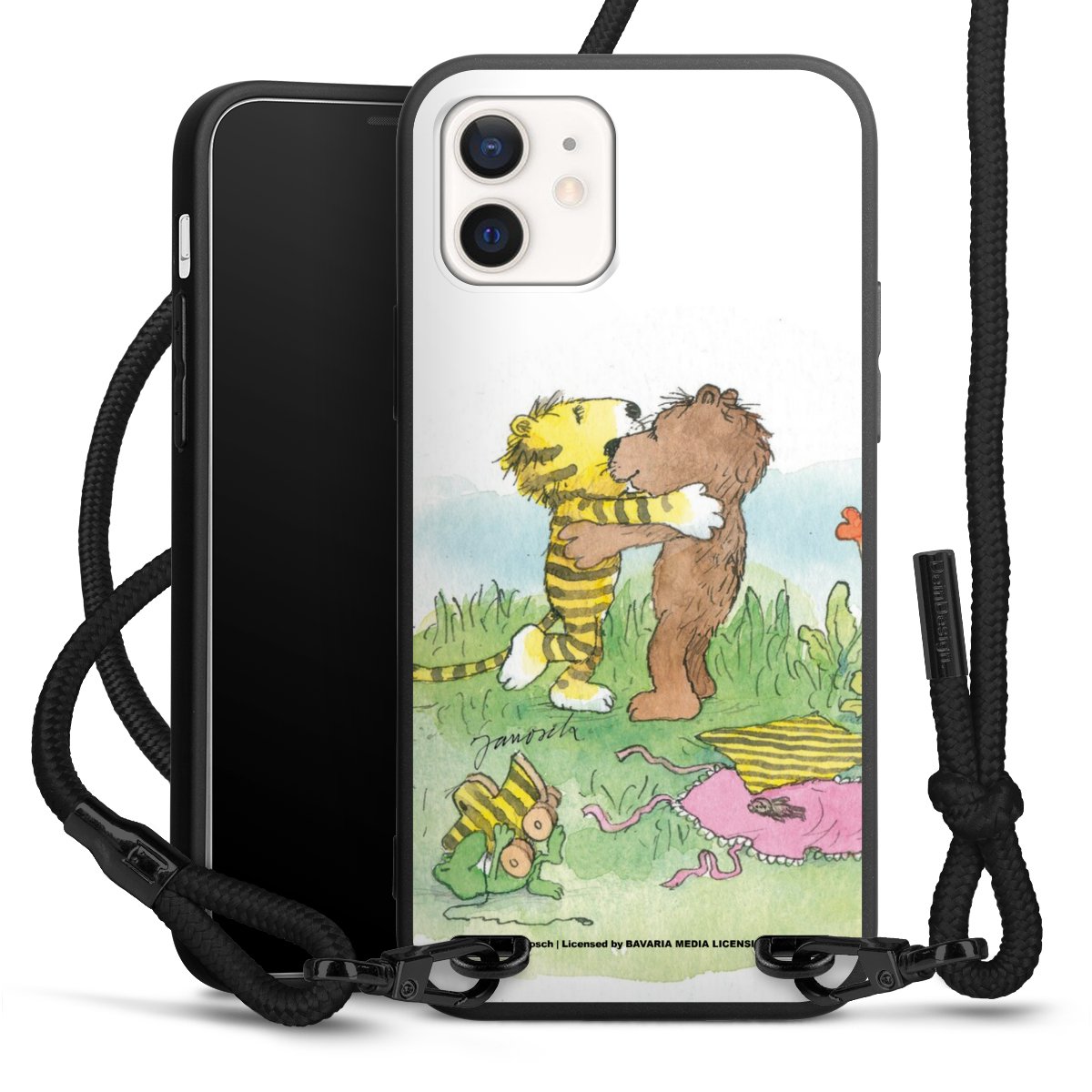 The matt black silicone case is made of flexible TPU (thermoplastic polyurethane) and offers robust protection. The durable, unbreakable material makes the cover flexible and dimensionally stable at the same time. The matte surface makes your design stand out more and is less susceptible to fingerprints and dirt. The stylish trend accessory fits comfortably in the hand and is perfectly complemented by the fabric (polyester) mobile phone strap. The braided fabric strap is approx. 1.70 metres long with a diameter of approx. 0.5 cm. Due to the special knotting technique, the length of the strap can be adjusted by simply pulling it, so that you can adapt it individually to your wishes. The practical case to wear around your neck is available with the fabric strap in black. As a little icing on the cake, we have provided the strap with a chic metal fastener in matt black. The strap is securely fastened to the case with loops made of high-quality genuine leather and press studs. The ends of the fabric strap are covered with metallic end caps and thus protected from fraying.