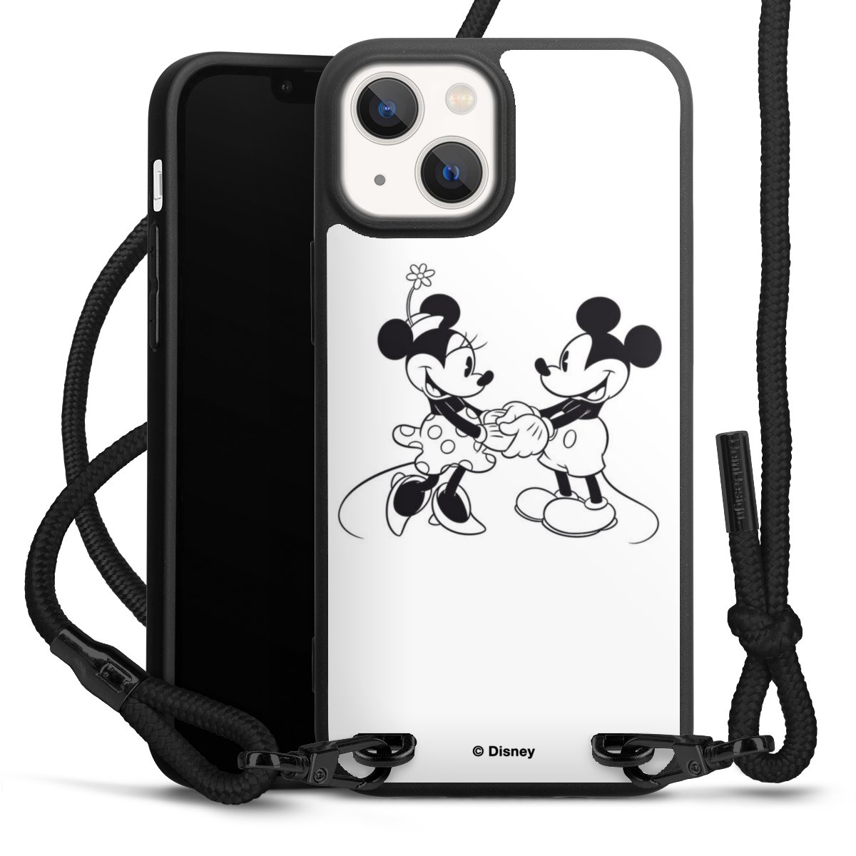 The matt black silicone case is made of flexible TPU (thermoplastic polyurethane) and offers robust protection. The durable, unbreakable material makes the cover flexible and dimensionally stable at the same time. The matte surface makes your design stand out more and is less susceptible to fingerprints and dirt. The stylish trend accessory fits comfortably in the hand and is perfectly complemented by the fabric (polyester) mobile phone strap. The braided fabric strap is approx. 1.70 metres long with a diameter of approx. 0.5 cm. Due to the special knotting technique, the length of the strap can be adjusted by simply pulling it, so that you can adapt it individually to your wishes. The practical case to wear around your neck is available with the fabric strap in black. As a little icing on the cake, we have provided the strap with a chic metal fastener in matt black. The strap is securely fastened to the case with loops made of high-quality genuine leather and press studs. The ends of the fabric strap are covered with metallic end caps and thus protected from fraying.